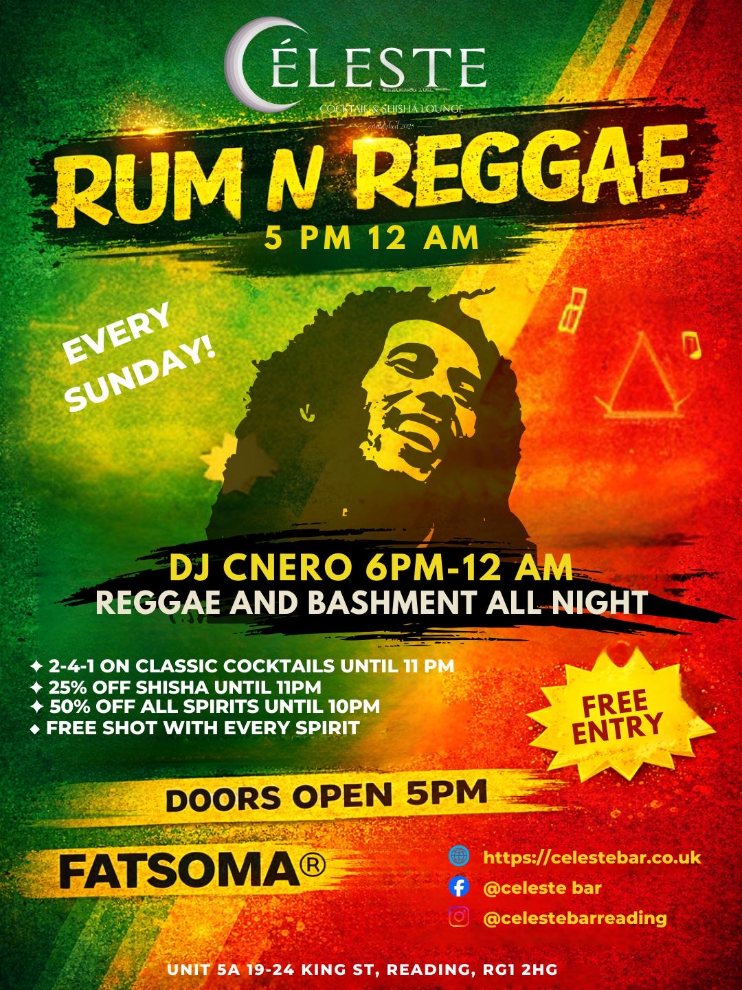 Close out your weekend in style with Rum N Reggae at Cรฉleste Cocktail & Shisha Lounge. Every Sunday from 5PMโ12AM, enjoy pure island vibes with DJ Cnero bringing the best in reggae and bashment all night long (6PMโ12AM).