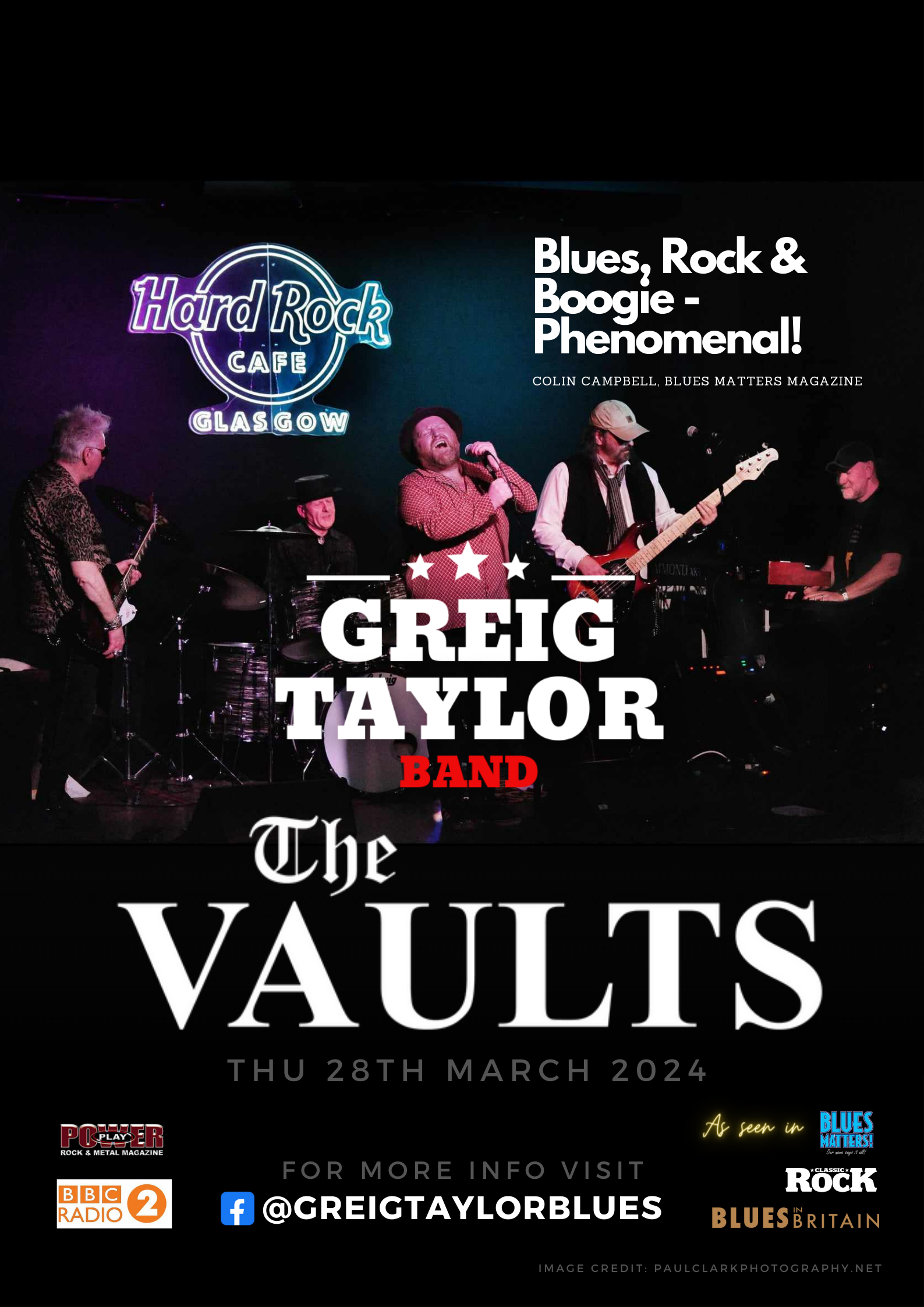 The Greig Taylor Band are one the UK's best blues bands, well-known for their electrifying powerhouse sound over a funky riff. The Greig Taylor Band's music is a cross-section of old and new blues, funk, and soul with Greig's amazing voice uplifting, rocking and powerfully raw and always packing a punch.