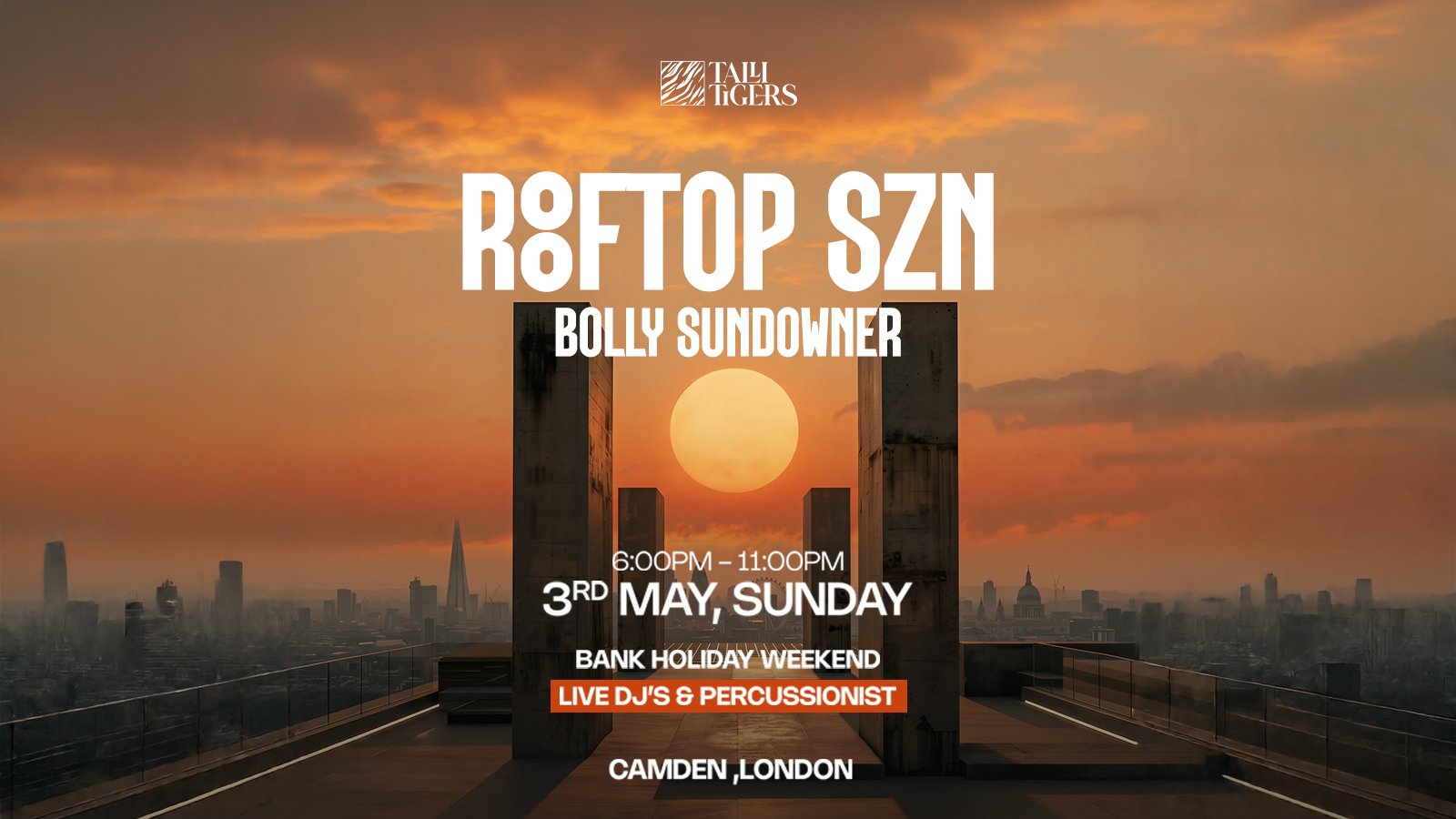 Bollywood, desi edits, vibes going from cute golden hour → full send after dark. 6–11PM @ Lock Inn Camden Rooftop Djkrishmusic on deck + live percussion.