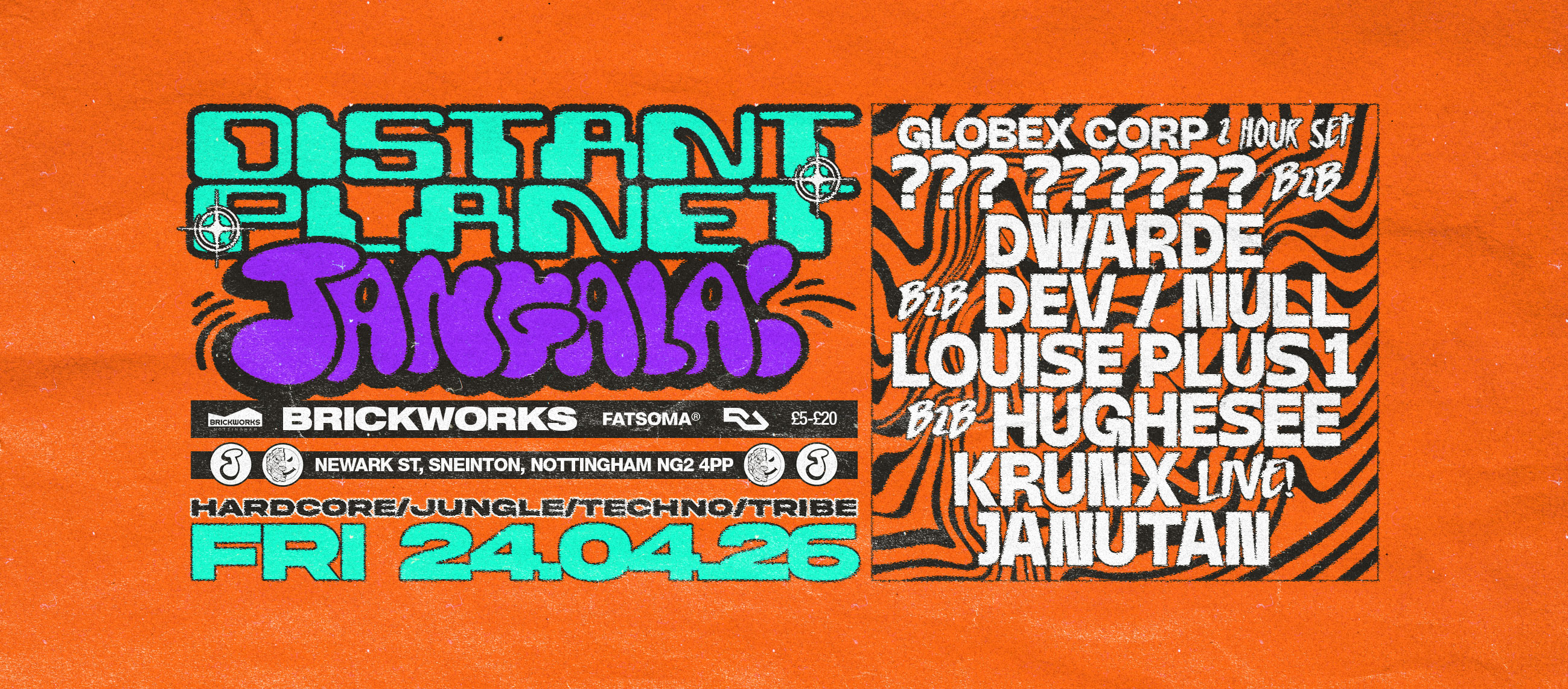 Friday 24th April Distant Planet and Jangala are back at The Brickworks, Nottingham with some of jungle, jungle techno and hardcore's favourite names.
