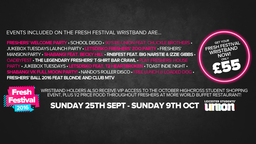 Fresh Festival 2016 is a two week extravaganza of events to welcome you to the social side of your new life at Leicester Uni, starting on Sunday 25th September.