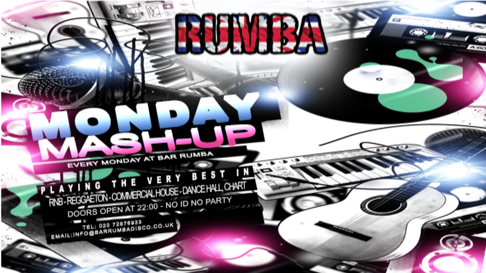 Live it up at Bar Rumba, the west end’s no.1 party basement!Every MondayGet down on the dance floor with our resident spinners playing the very best in:RnB//Reggaeton//Commercial House//Dancehall//ChartMonday night just got a whole lot better! Begin the week on a Mash Up!Doors open @ 10pm and we carry the party on until 3am every Monday!For Birthdays, tables and guest list call: 0207 287 6933 or email: info@barrumbadisco.co.uk click the button below.Bar Rumba is an 18+ Venue. ID is mandatory, those without it will not be admitted into the venue. Each individual is subject to being searched upon entry.See you on the dance floor!