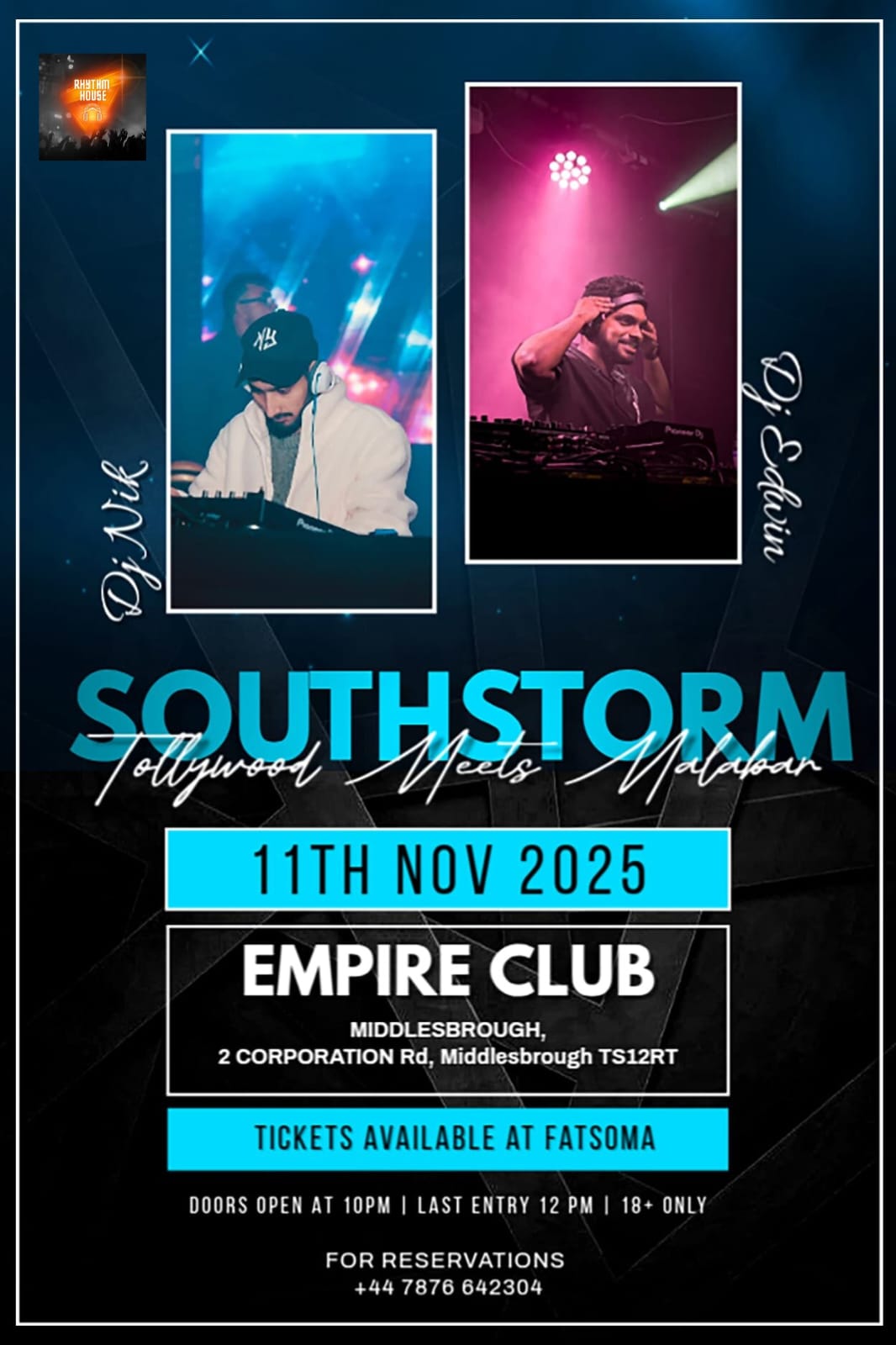 Join us as Southstrom brings you Tollywood Meets Malabar, a high-octane DJ night blending the vibrant rhythms of Telugu, Malayalam, Tamil music with a global club twist. Expect the hottest Tollywood hits, Malabar anthems, and South Indian bangers — all mixed live by top DJs who know how to keep the dancefloor alive whole night!