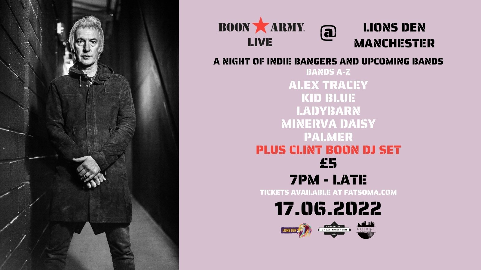 A monthly night of Indie Bangers with DJ Clint Boon plus Live Music from Upcoming Bands/Artists, in collaboration with District Records at Lions Den Manchester!