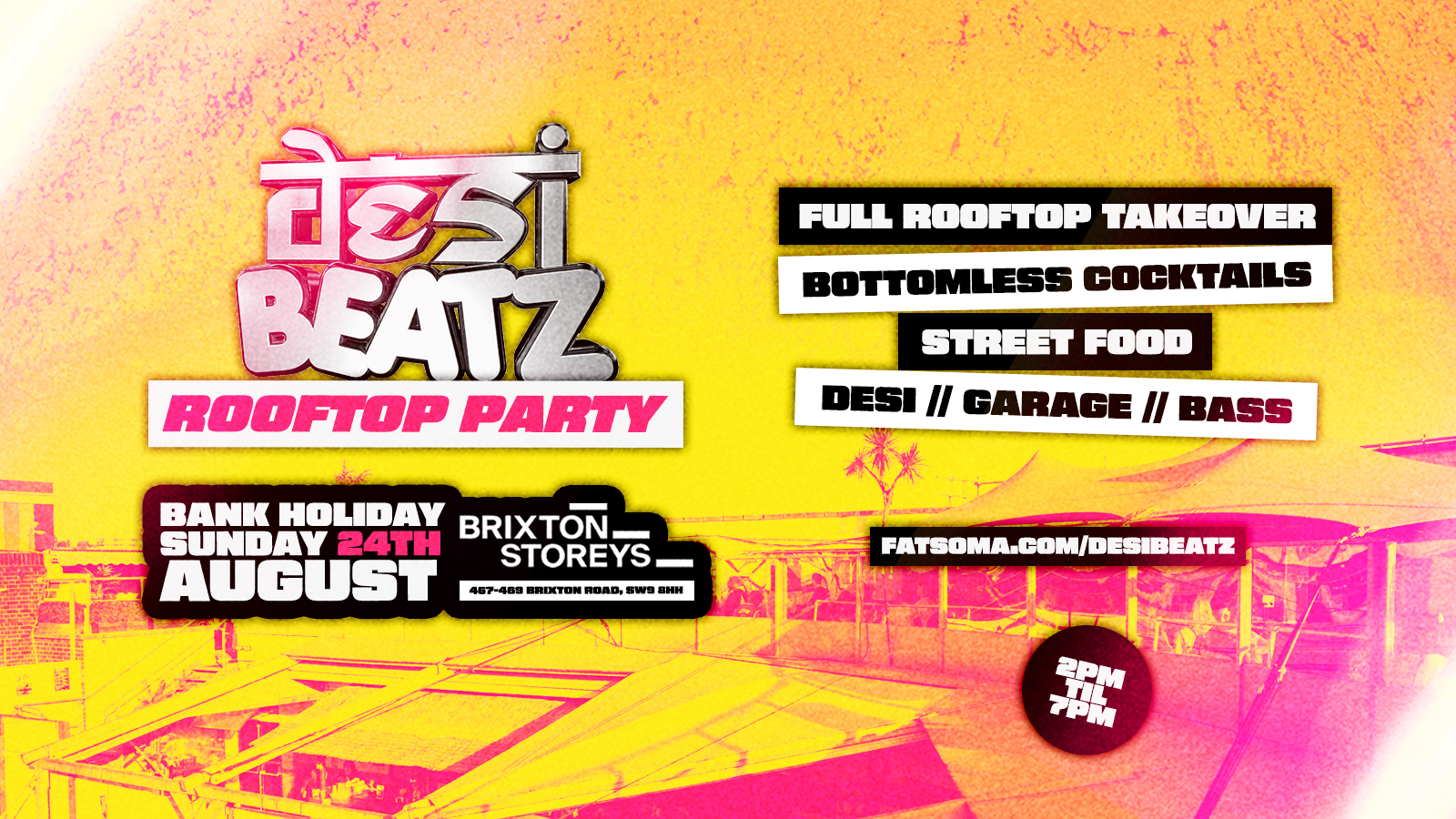 ROOFTOP PARTY : we will be taking over an amazing outdoor space in the heart of London, with fully seated reservable areas for all groups attending, BOTTOMLESS COCKTAILS TICKETS (1 hour), multiple well stocked bars & an amazing street food vendor serving BRUNCH throughout the event!