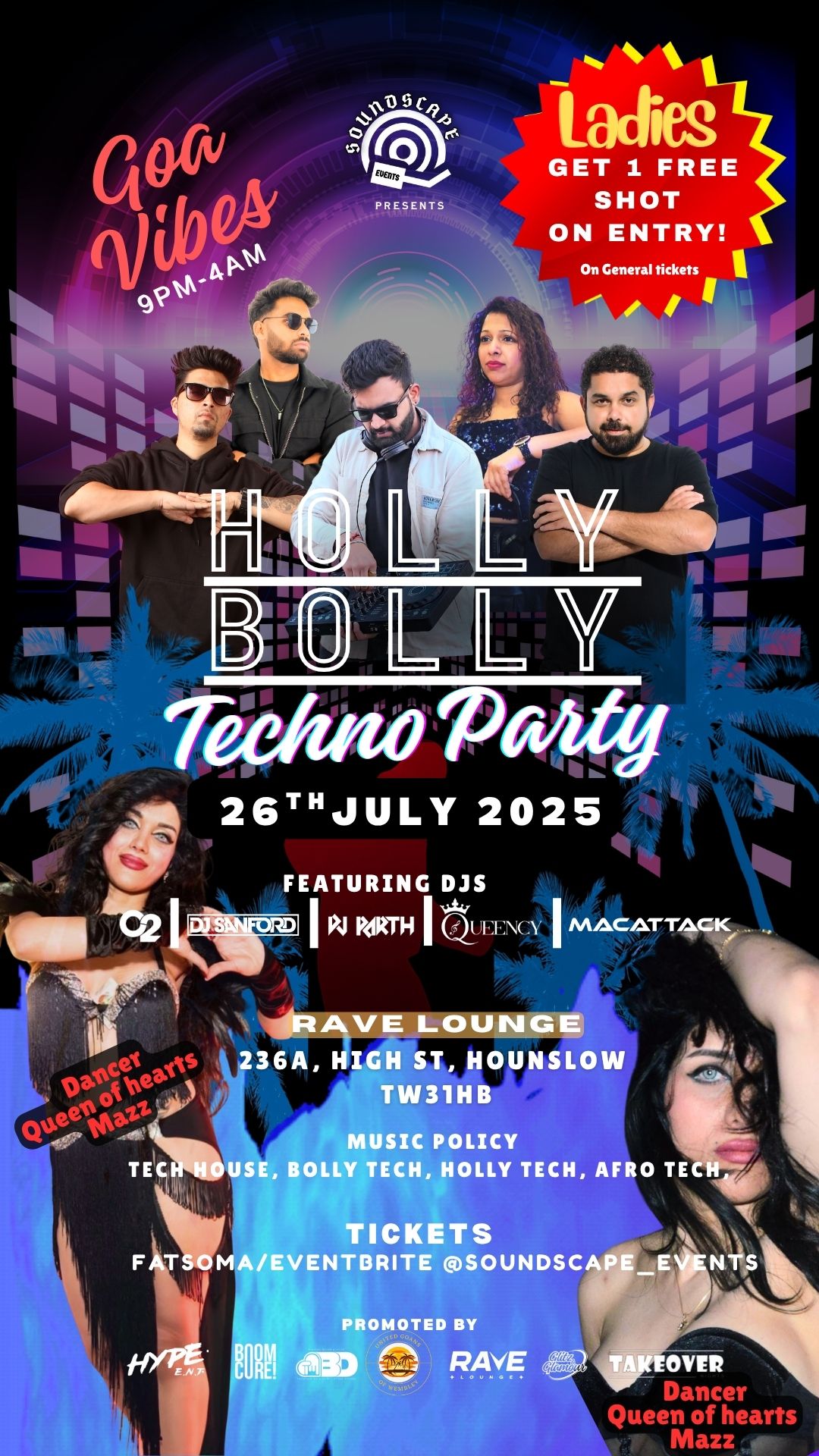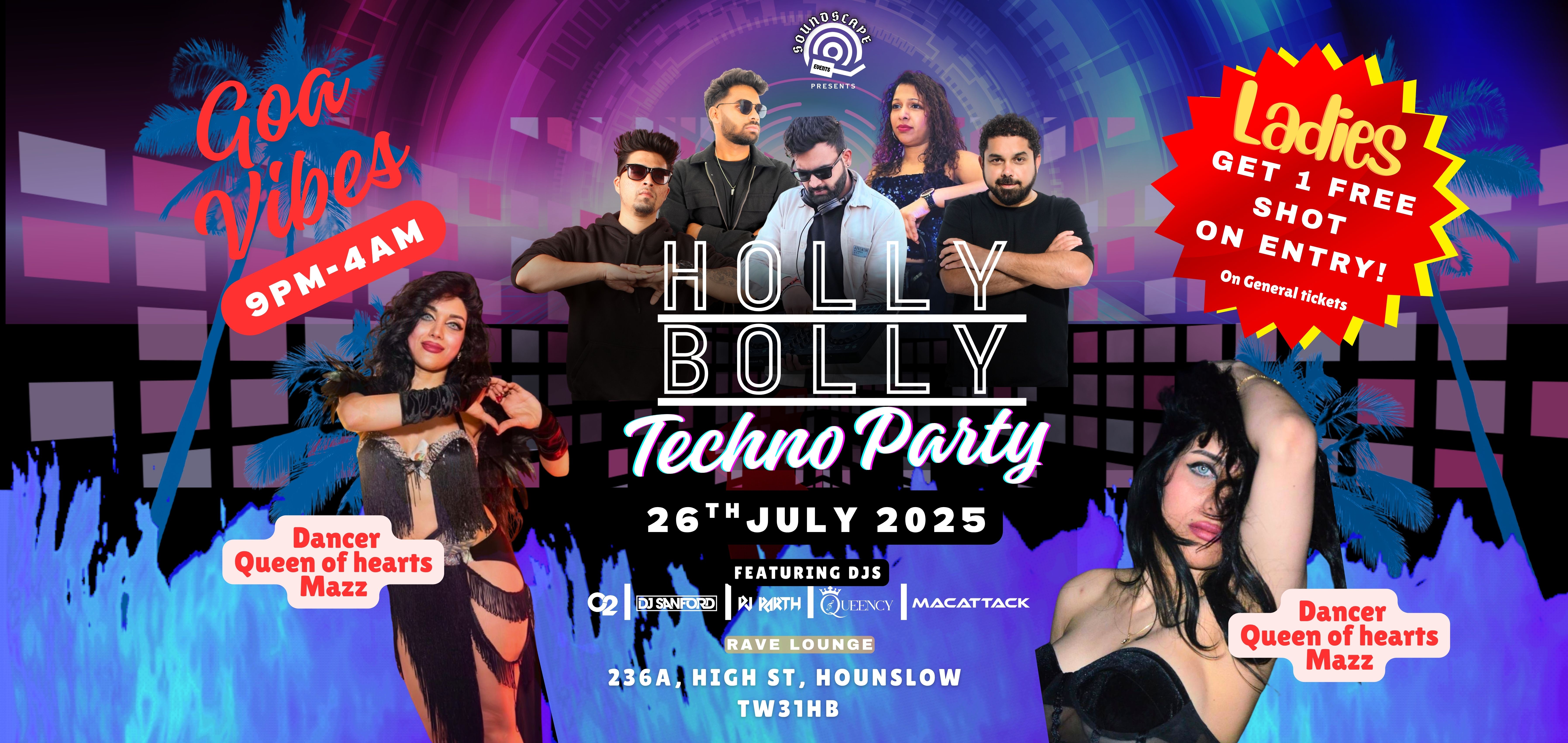 Join us for a night infused with Goa’s vibrant nightlife energy, featuring electrifying Holly-Bolly techno beats. Only at Rave lounge, Hounslow TW3 1HB, on Saturday, 26th July 2025, from 9 PM to 4 AM.