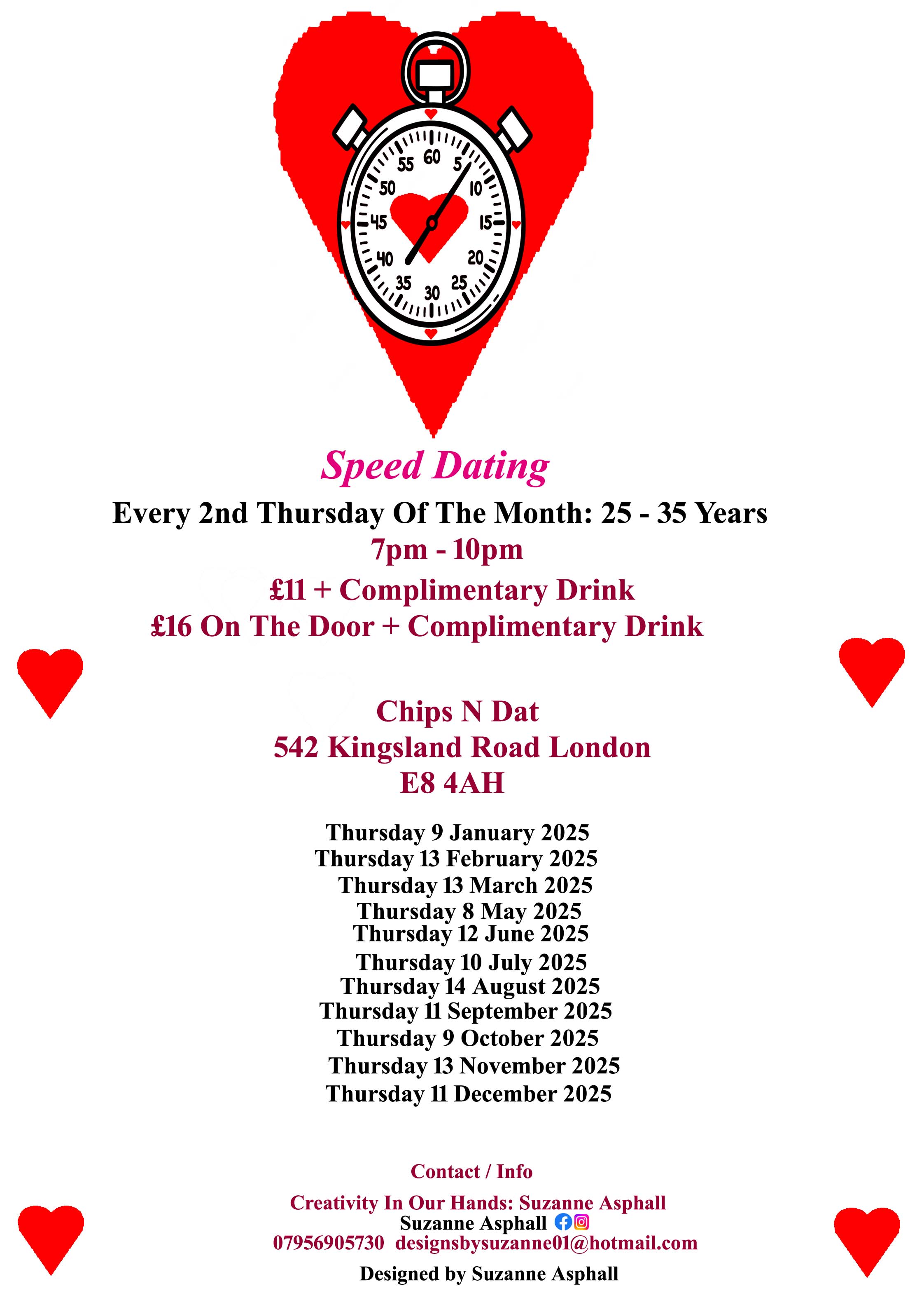 Speed Dating: It’s time for love. The experience, of meeting someone new, to form a connection. Taking place at Chips N Dat. A cosy, bar and dining, in the heart of Dalston.