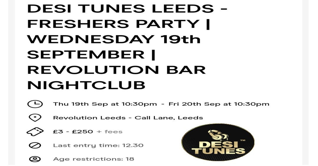 The UK's UP coming music event company Desi Tunes are in Leeds for our Freshers Party, and it's going to be legendary! Join us as Leeds super club REVOLUTION BAR and create unforgettable memories, all whilst hearing the best Bollywood & Bhangra and limited south Asian music around!
