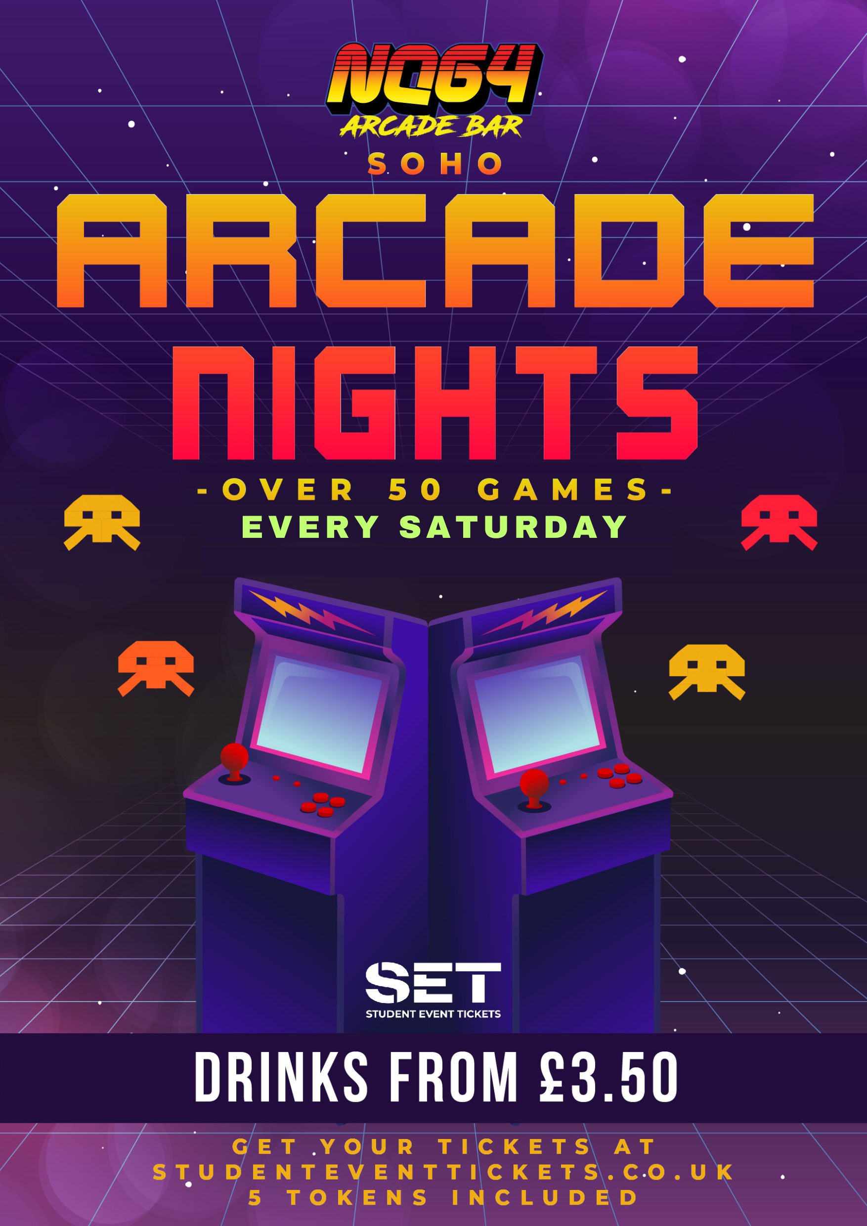 Grab your ticket now for our Arcade Nights at NQ64 Soho! Each ticket includes 5 tokens for games on arrival, and student drink prices all night long from £3.50!🍹