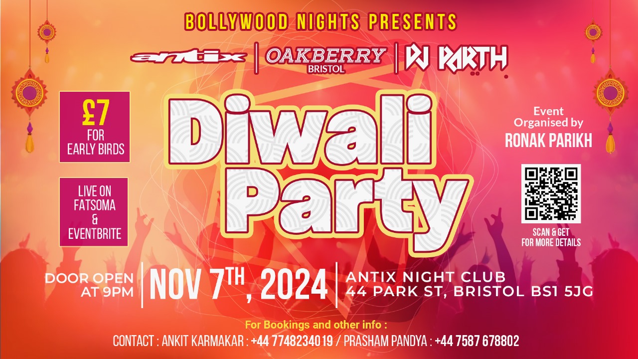 Welcome to DIWALI | BOLLYWOOD NIGHT at Antix in association with Oakberry Acai , Bristol featuring DJ Parth! Get ready to experience a night filled with vibrant music, energetic dances, and delicious food. Join us for a celebration of all things Bollywood, from classic tunes to the latest hits. Dress to impress in your best Bollywood-inspired attire and dance the night away with friends and fellow enthusiasts. Don't miss out on this unforgettable evening of entertainment and fun! See you there!