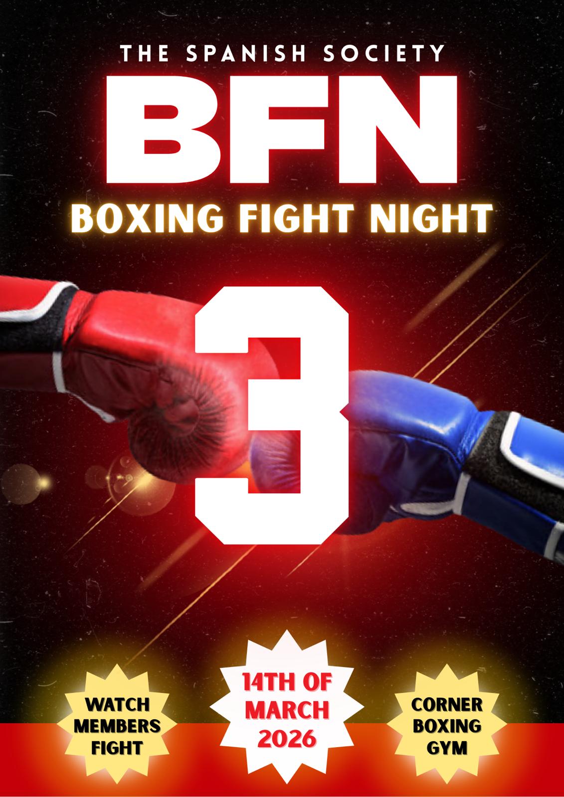 Join Spanish Society UoM for our 3rd Annual Boxing Fight Night, where student fighters step into the ring to represent pride, passion, and pure determination. Expect an electric atmosphere, walkouts, lights, music, and non-stop action from the first bell to the last.