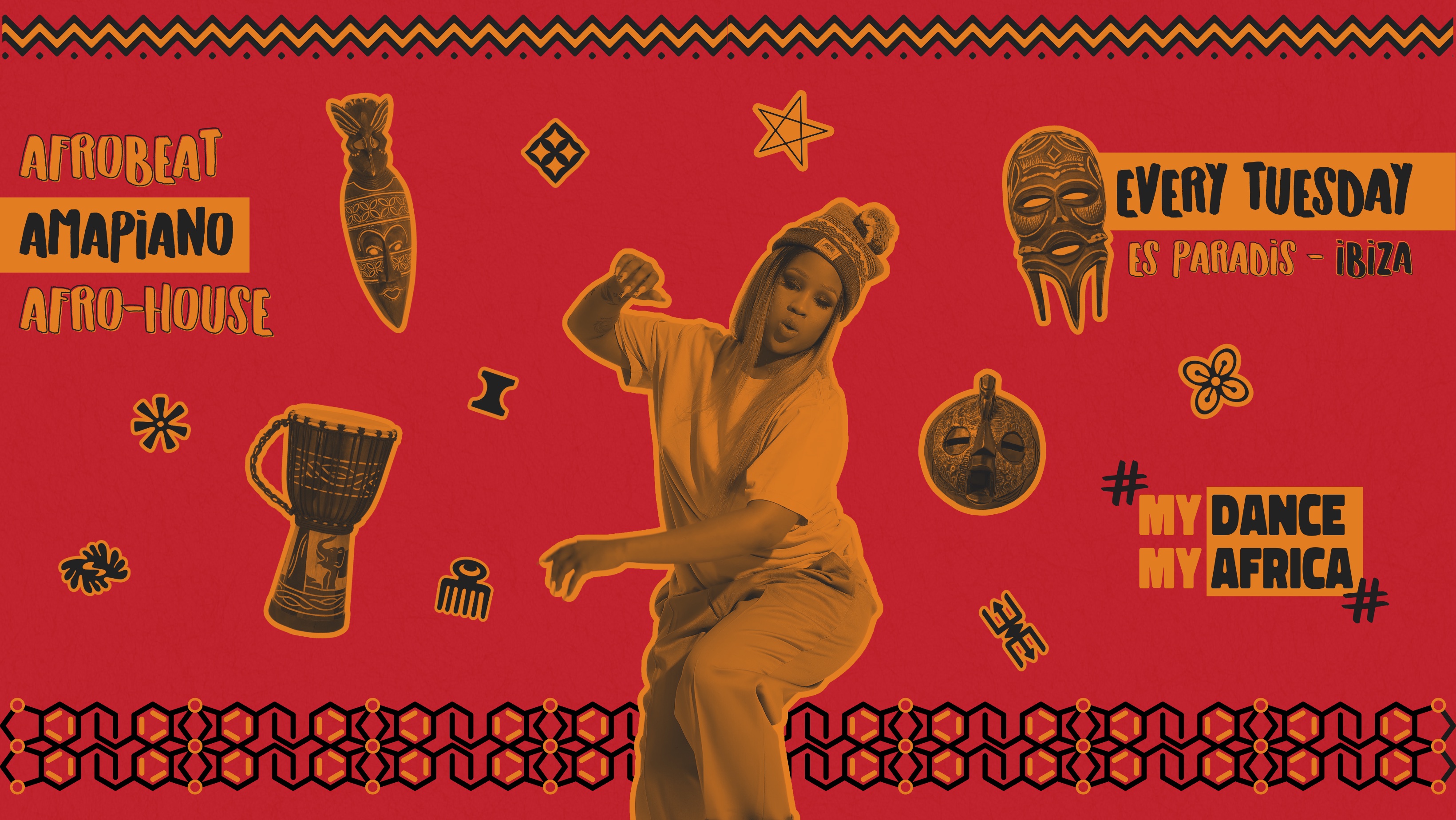 Dance Africa is a cultural celebration of African music taking place at Es Paradis. The goal is to uplift and unite the people in Dance with the most beautiful African sounds, which are considered to be the most uplifting sounds in the world. From the electronic blooming bass stabs to the hand drums and shakers, everything comes together to create a soul-snatching sound that truly takes you to another place far away from home.