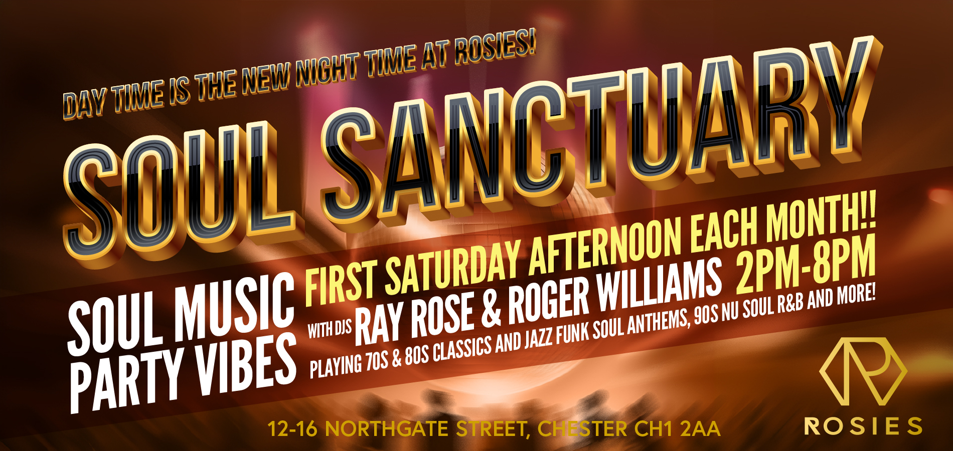Get ready to groove to the smooth sounds of modern soul, classic soul, rare groove, and two-step at this daytime club event. DJs Ray Rose and Roger Williams will be spinning the soulful tunes that will have you dancing all day long! It's going to be an incredible soul sanctuary experience!