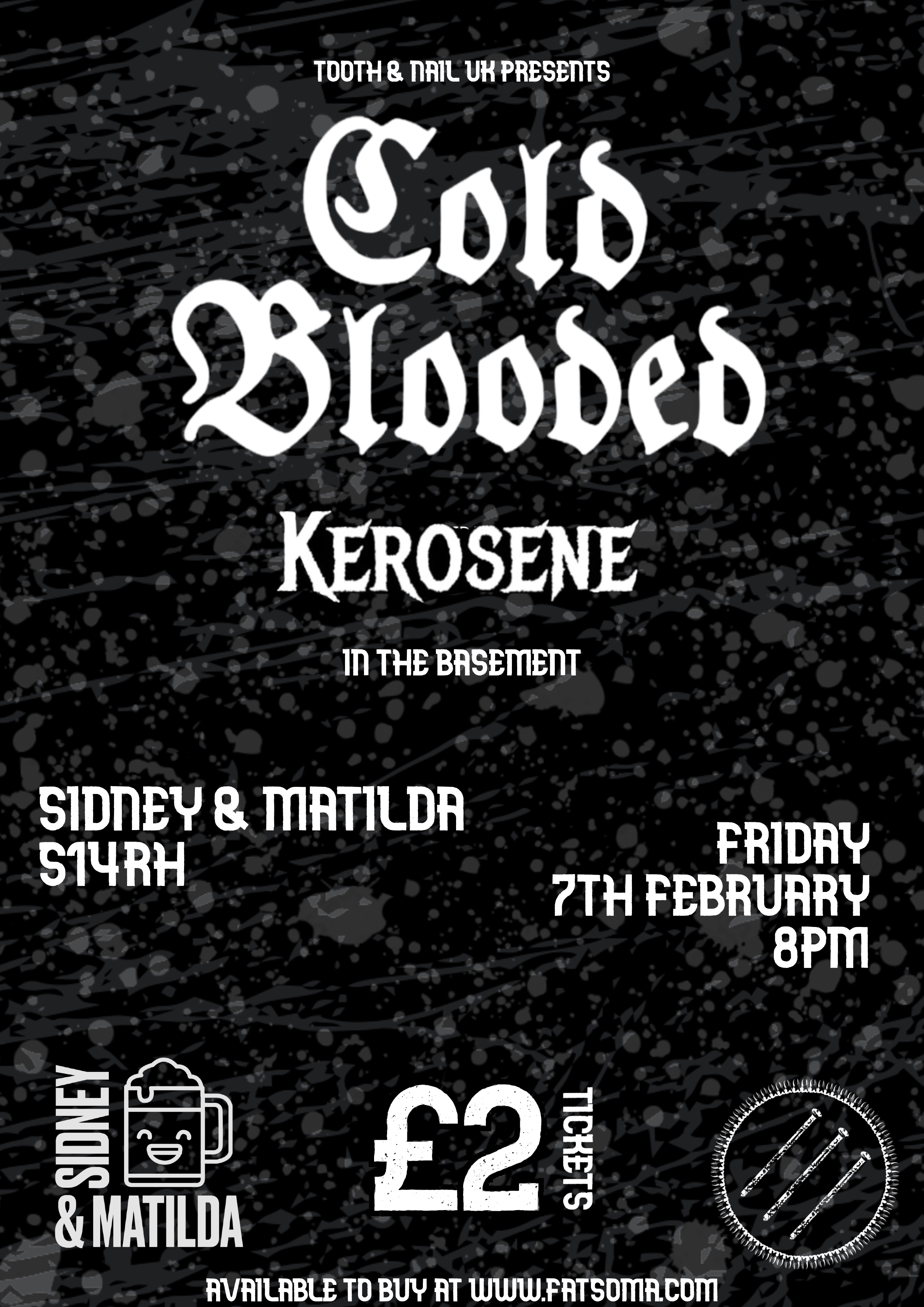 Hardcore punk legends Cold Blooded pair up with Doncaster carnage trio Kerosene to bring a night of chaos and noise to Sheffield's Sidney and Matilda Basement. 7th February.