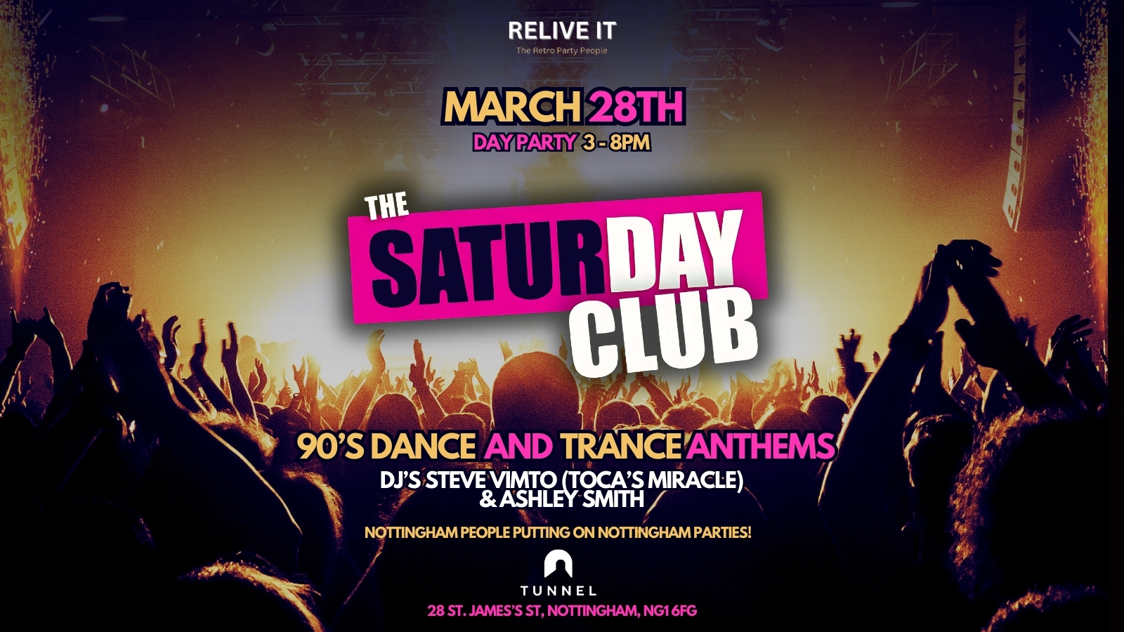Our first Saturday Club of the year lands on Saturday 28th March, and we’re going straight back to what this party is built on — 90s dance & trance anthems, played properly, in the daytime, with the right people.
