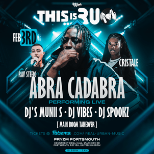 THIS IS R.U.M arrives in Portsmouth for an event that will be the talk of the town. UK RAP superstar ABRA CADBRA & upcoming female rapper CRISTALE will both be performing live at PRYMZ Portsmouth for an exclusive main room R.U.M takeover.