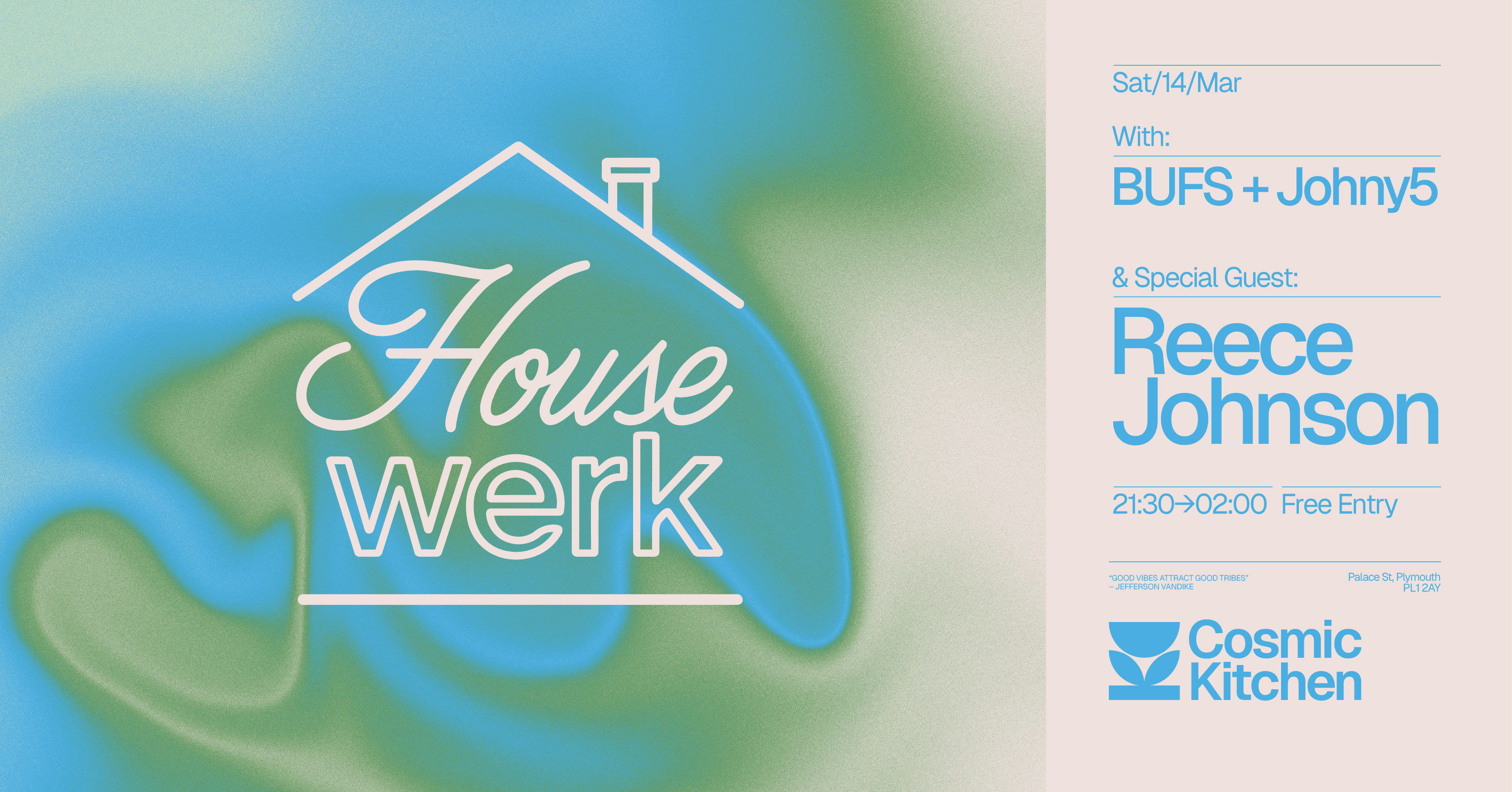 Housewerk is a monthly dancefloor gathering curated by BUFS taking place on the second Saturday of every month at Cosmic Kitchen. Built on a foundation of jackin’, Chicago, and classic house sounds, Housewerk brings high-energy sets, deep grooves, and a warm, open vibe to the heart of the city. Each month, BUFS invites a rotating cast of guest DJs and friends into the mix, keeping the energy fresh and the selections on point. Expect good people, good records, and proper dancefloor heat — every time!