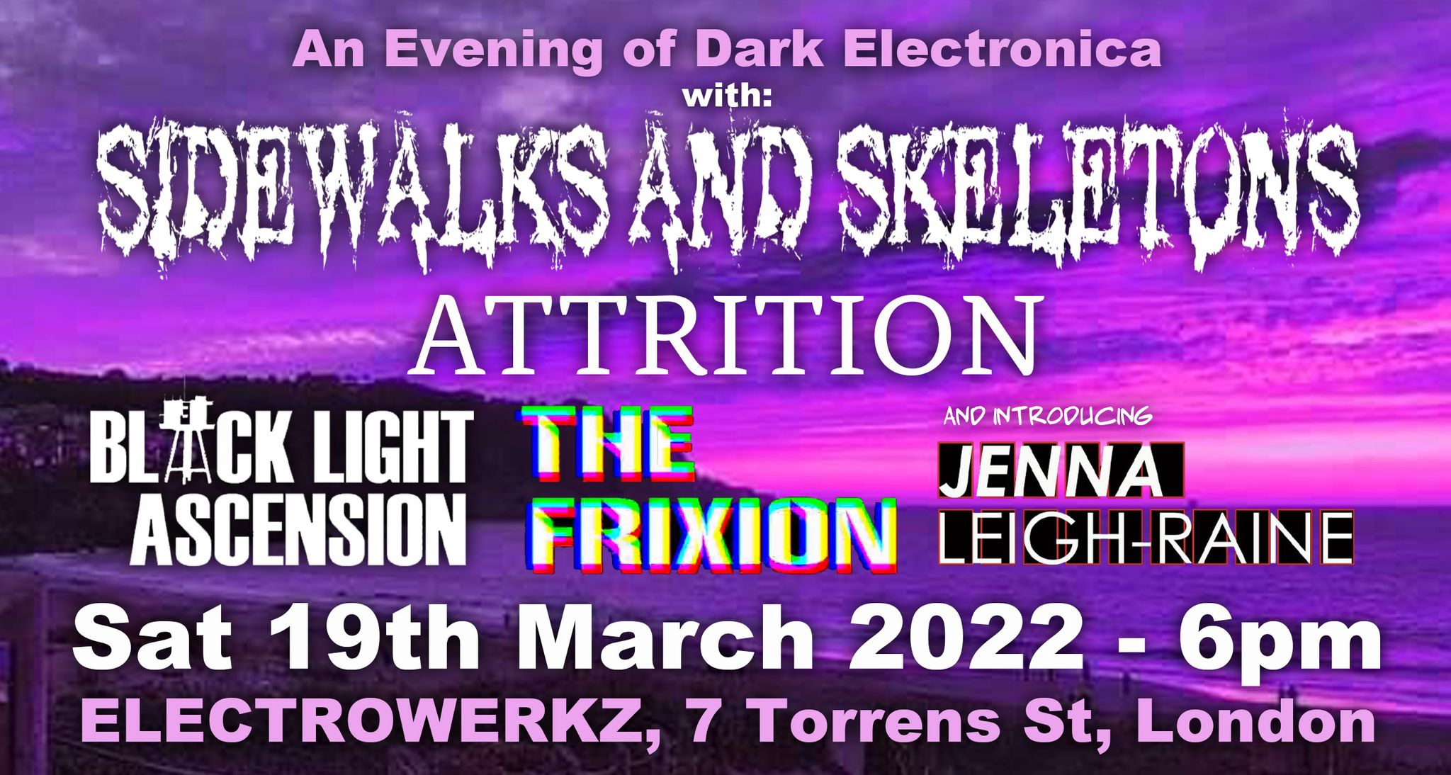 PRESS RELEASE: Flag Promotions present an evening of delightfully dark and eclectic electronica, from the spooky witch house breakbeat and infectious rhythms of SIDEWALKS AND SKELETONS, to the dark haunting pulse laden ATTRITION to the post punk, Joy Division inspired BLACK LIGHT ASCENSION to the shimmering electro pop of THE FRIXION and JENNA LEIGH-RAINE it will be an absolute electro feast that will likely never be repeated!