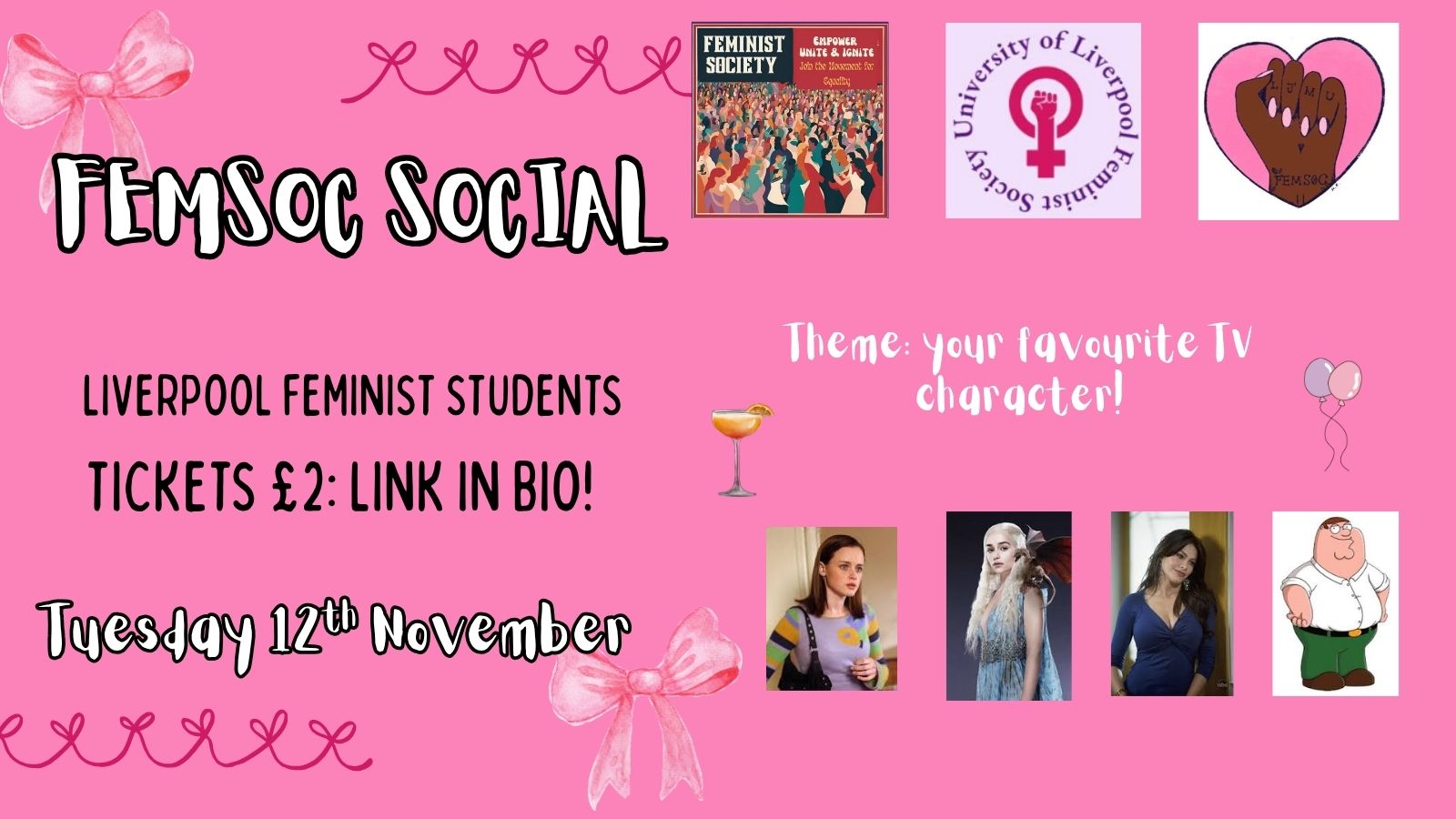 Join us for a TV–themed feminist pub crawl celebrating friendship, community, and empowerment across Liverpool. Enjoy discounted drinks along the route 💅🍂
