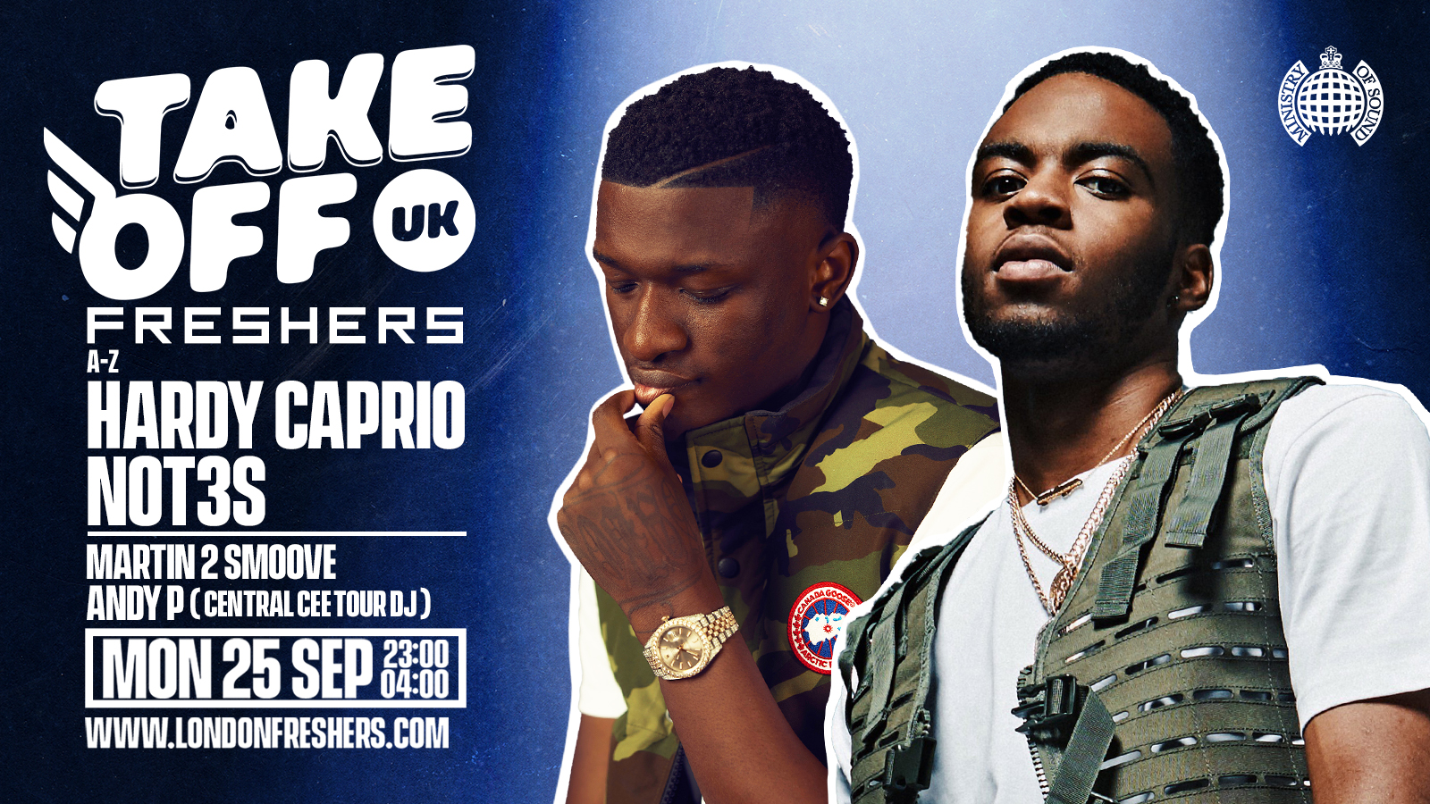 BOOK TICKETS HERE: https://www.fatsoma.com/e/wd3jf5ai/take-off-uk-freshers-rave-at-ministry-of-sound-feat-not3s-hardy-caprio-huge-special-guests-tba
