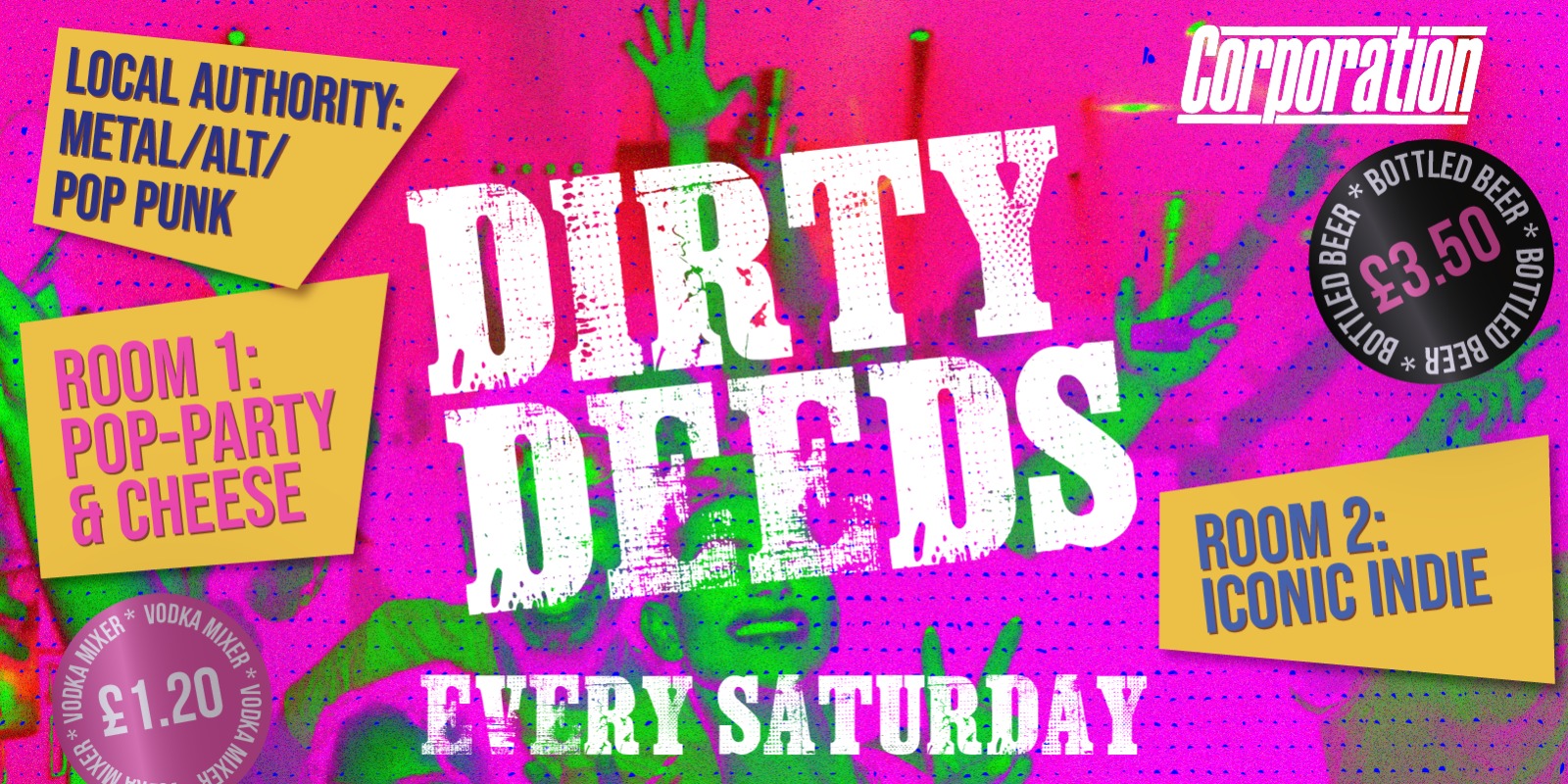 Enjoy the cheapest drinks in Sheff on a Saturday night, alongside the best tunes and the biggest atmosphere! Whether you’re rocking out upstairs or jamming to some Taylor Swift… We’ve got 4 rooms to pick from. We strongly advise getting a ticket to our Dirty Deeds nights. £1.30 Vodka Mixers l £1 sourz l £1.50 ALL spirits & mixers l 5 for £12 J-Bombs l £4.50 Dbl Morgans & Mixer l £3.50 Bottled Beers