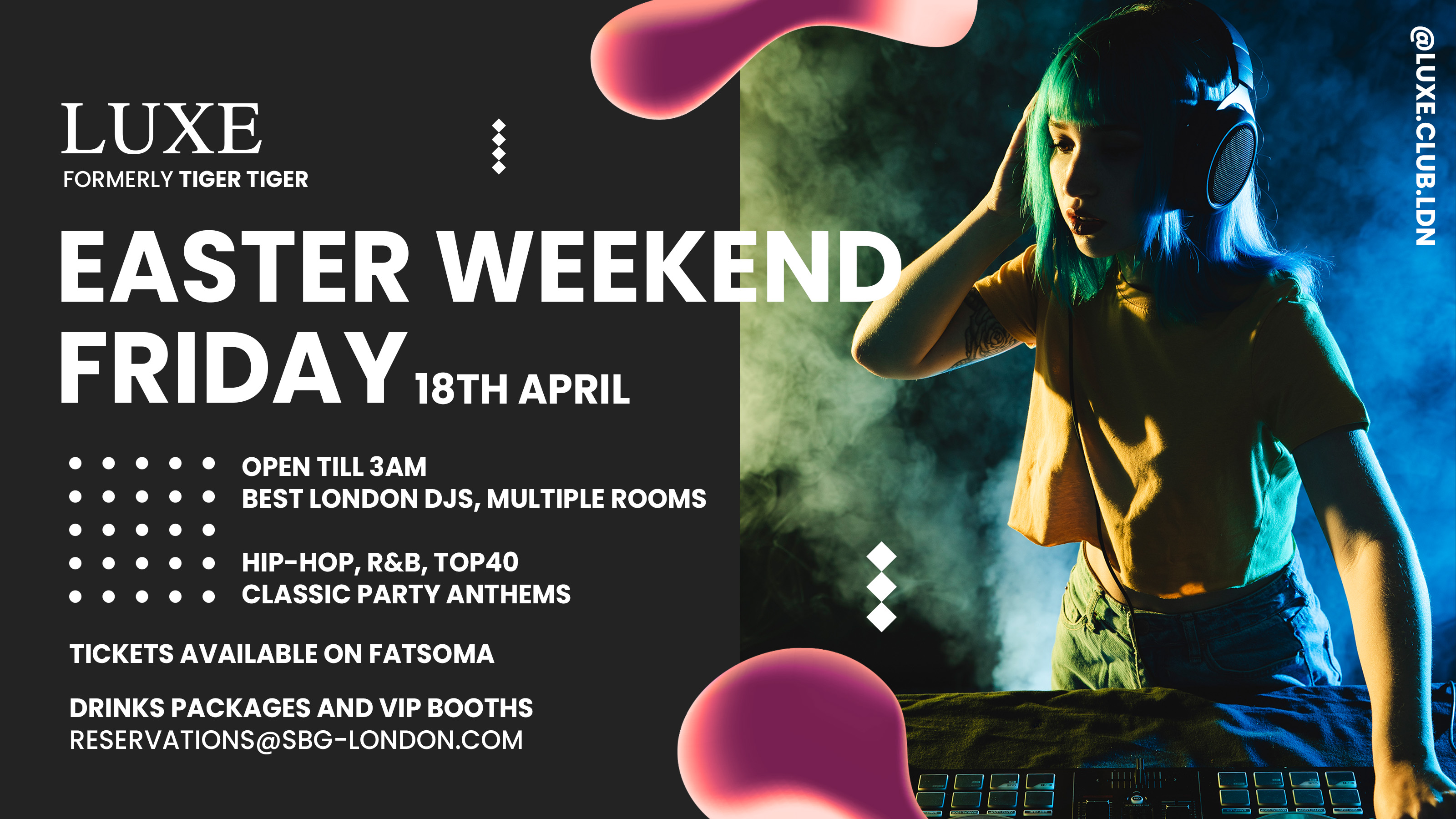 Hop into the Easter weekend at Luxe, where the party never takes a holiday! Expect back-to-back DJ sets across multiple rooms, dropping the best in commercial hits, R&B, and club anthems to keep you dancing till dawn. Our VIP booths come with bottle sparklers, top-up packages, and prime views of the DJ, making them the perfect spot to celebrate with your friends!