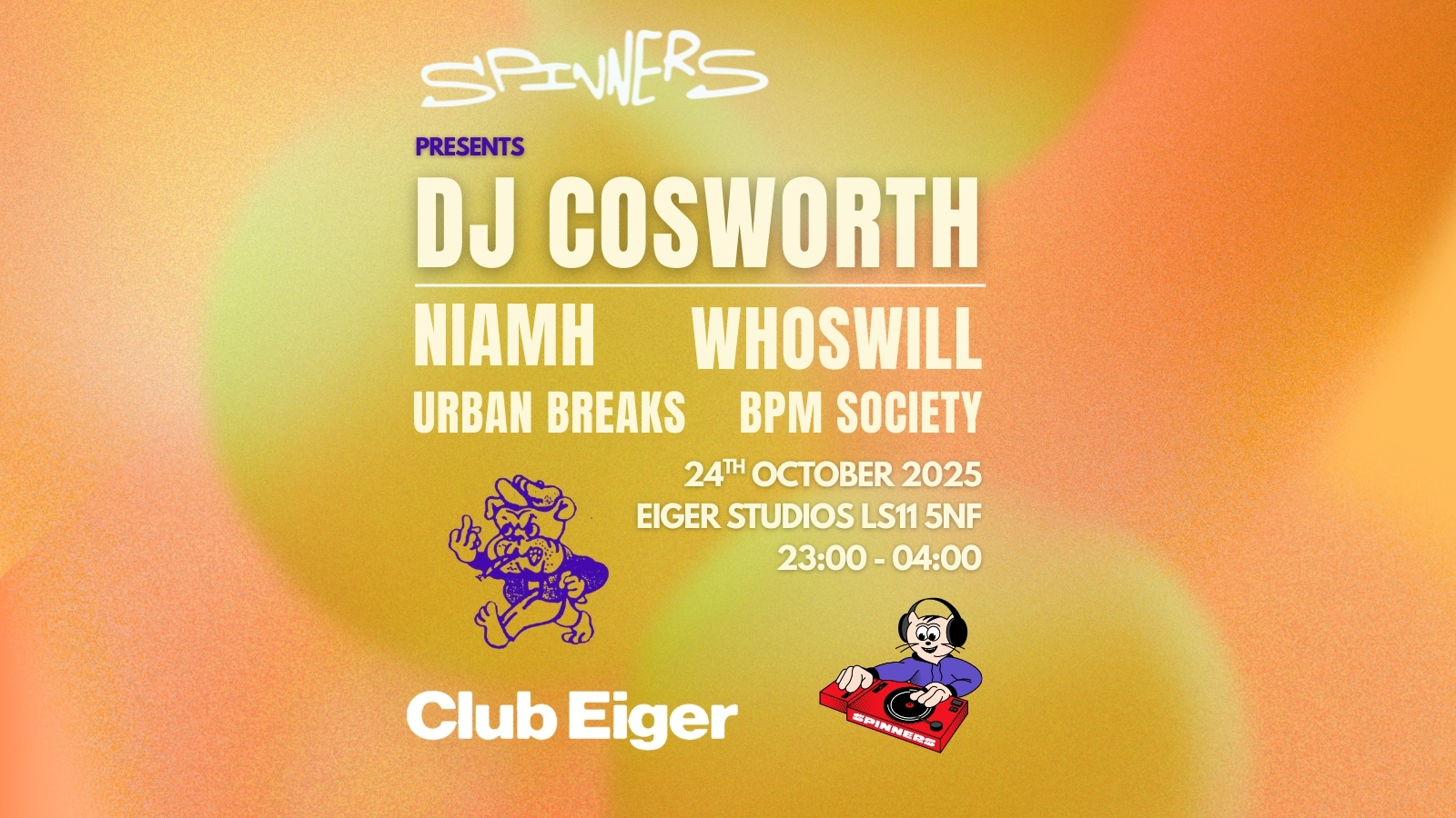 Spinners present Bristol heavyweight and Hardline label boss DJ Cosworth. Having last played in Leeds over 2 years ago, DJ Cosworth + support will provide an unmissable night of house, tech, funky and garage music!