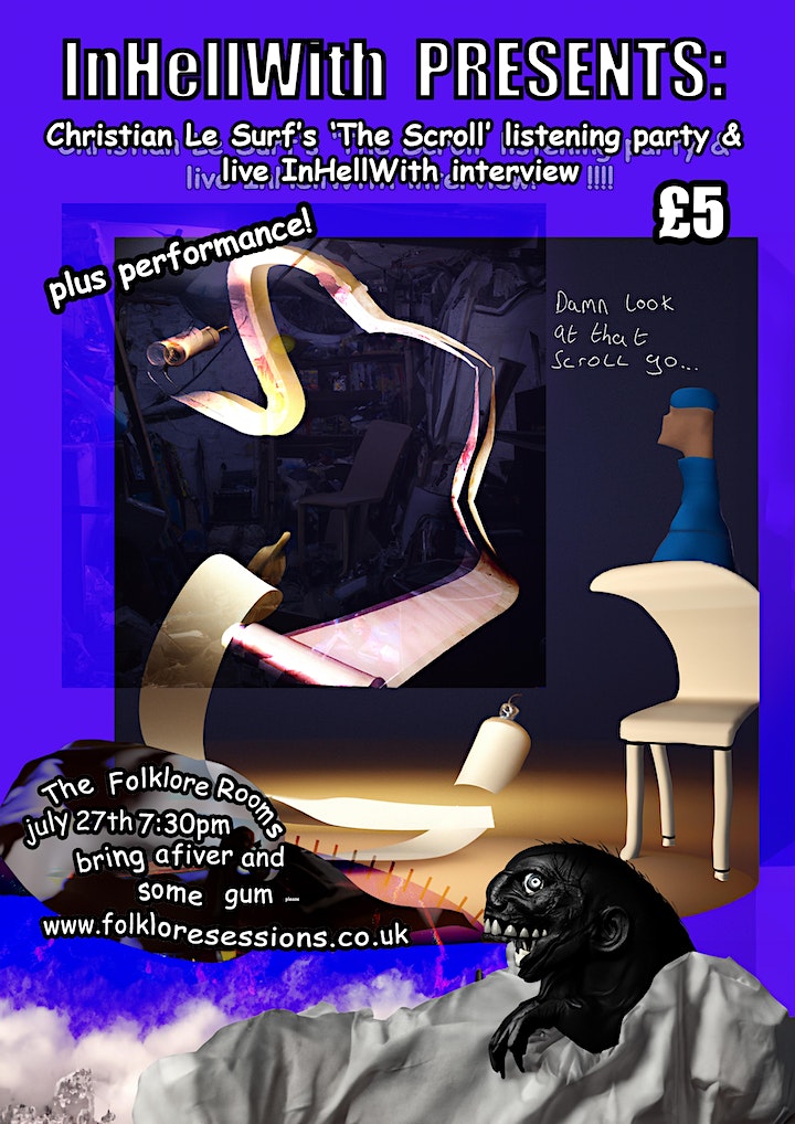 Christian Le Surf, an experimental pop singer-songwriter has begun to expand his world of music with 'The Scroll', a lengthy, multi-phased, polymetric piece. Influenced by the musings of composers like Steve Reich, Julius Eastman and Mikel Rouse, Christian invites you all to this listening party, co-hosted with Caleb Absalom from InHellWith who will be exchanging discussions and some unforgiving questions...! The event will also be followed by an informal performance from Christian whose live performances deliver a multitude of approaches whether it be through folk-driven lullabies or explosive and psychedelic loop-pedal based jams.
