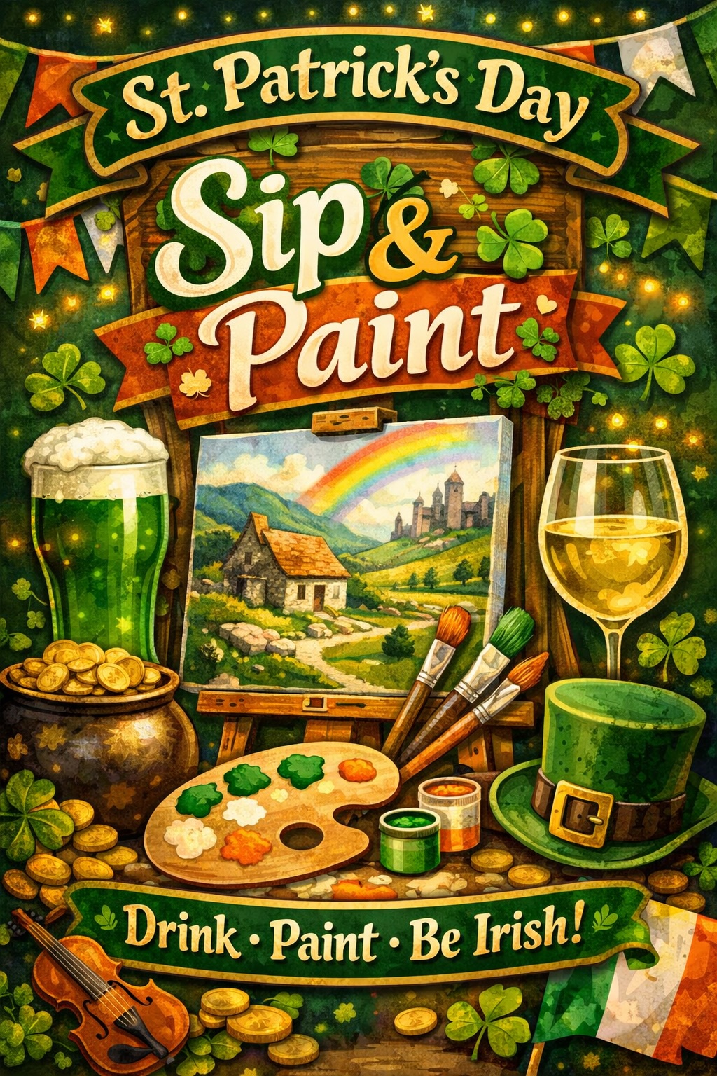 Join us for a festive Irish-themed Sip & Paint where the drinks are flowing, the colors are popping, and the craic is mighty ☘️