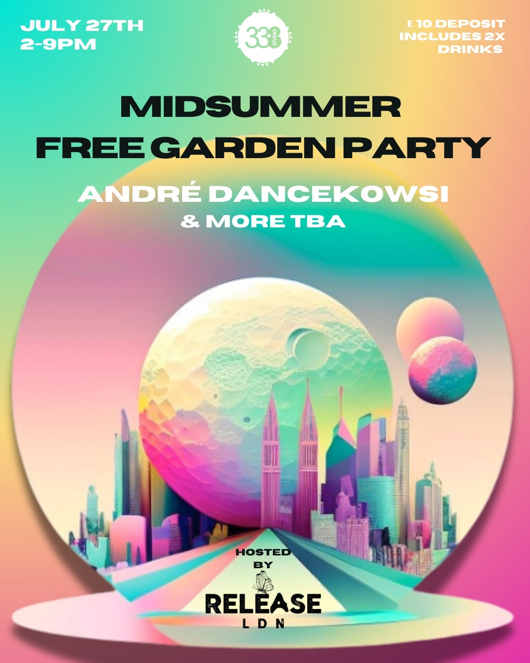 So on the 27th of July we will be teaming up with the always amazing Release to put together a free entry midsummer day time rave. DJ André Dancekowski will be joining us from Munich to lay down some vibes in the sunshine alongside Release favourites Syncia, Bowditch, Dan Solo and Hypercolour's Alex Jones. We only ask for a £10 deposit which will be given back to you on arrival in the form of 2 drinks tokens to spend on beers, wines, ciders and house cocktails.