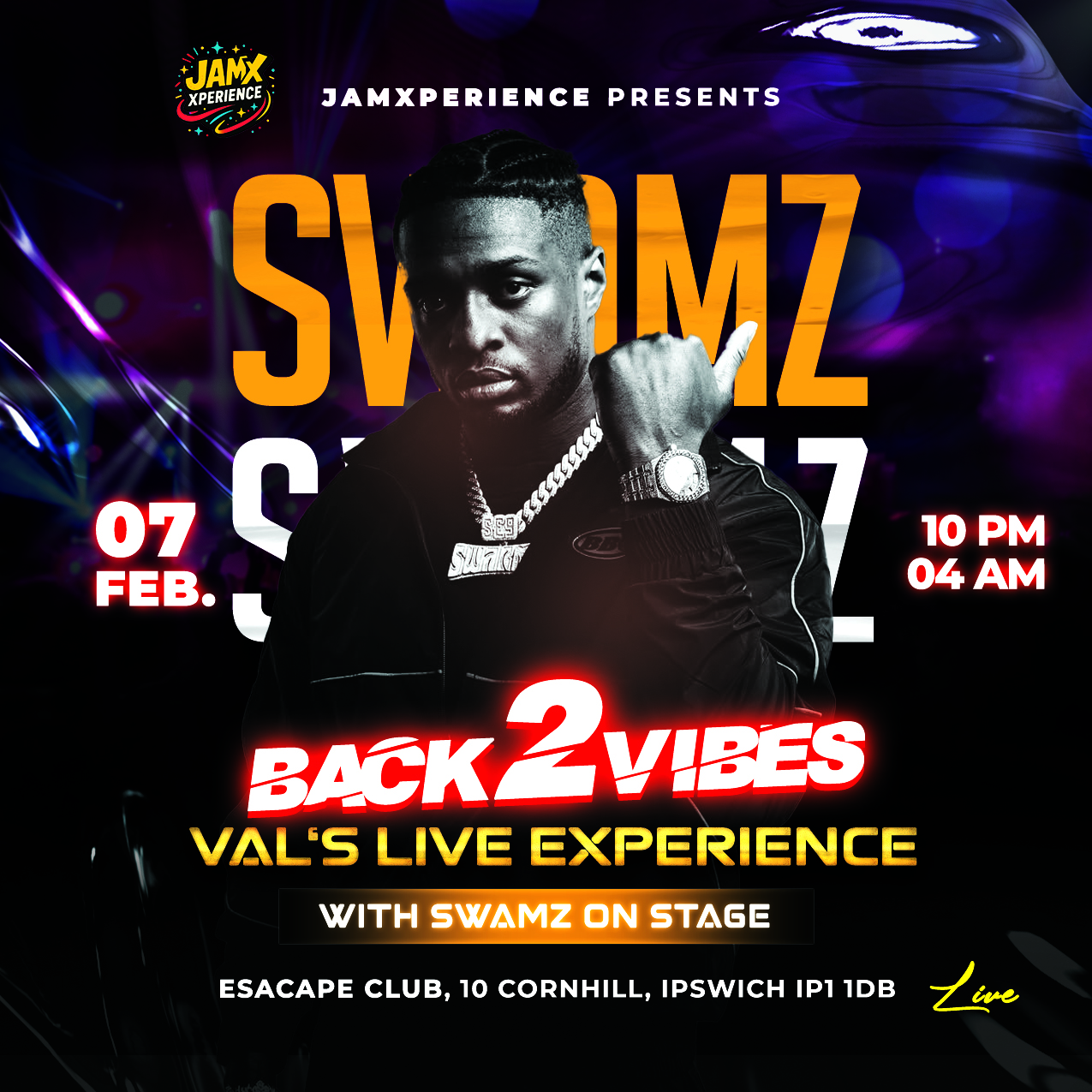 Get ready for an unforgettable night as Val’s Live Experience takes over Ipswich with special guest Swarmz performing live on stage.