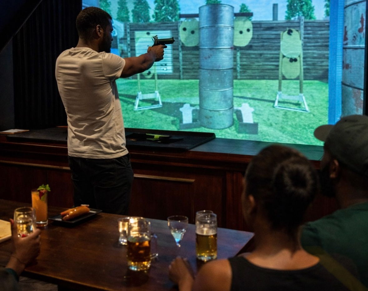 A modern simulation shooting range with private booths, immersive games, and a full bar — ideal for group socials and networking nights.