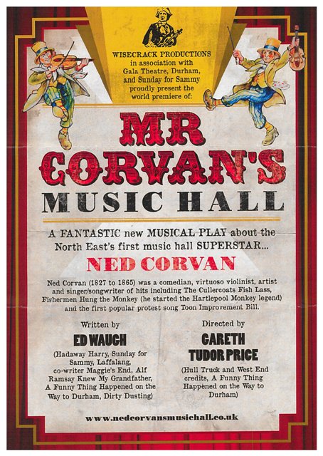North East scriptwriter Ed Waugh will be talking about the history and background to his new play Mr Corvan's Music Hall at the Central Library Hartlepool. Find out about Ned Corvan's life and career - how he wrote the first ever Monkey Legend song - and his links to Billy Purvis!