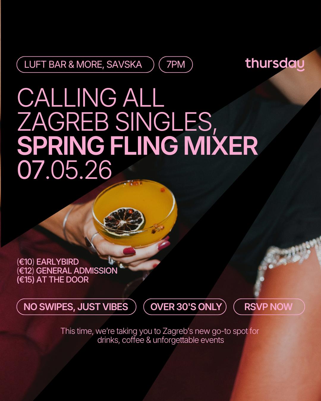 Hey Zagreb! On Thursday, May 7th, Luft bar & more hosts a Spring Fling Mixer designed for real conversations, great music, and easy chemistry. One rule only: everyone here is single.