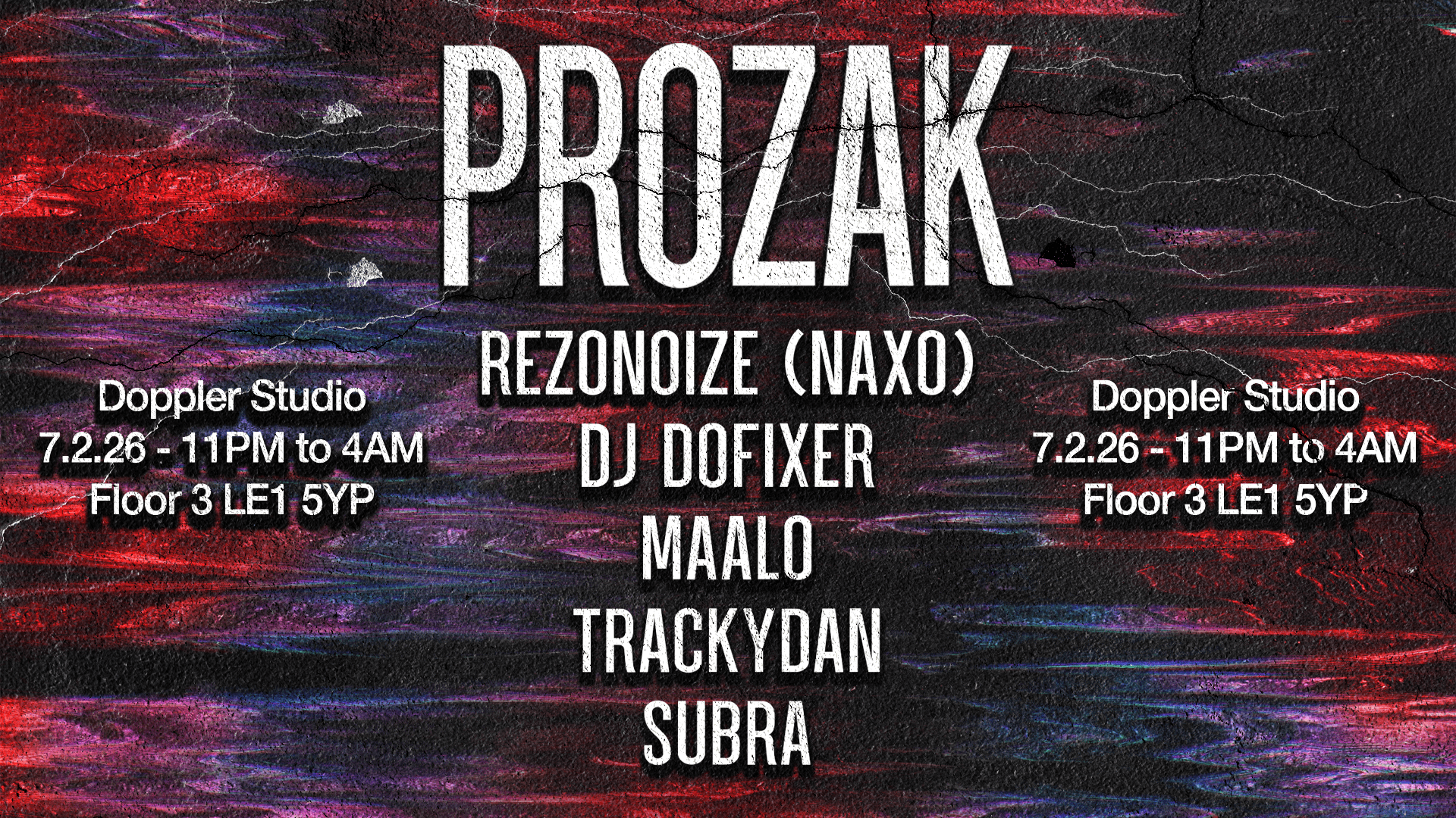 This event features new faces like Naxo, half of Rezonoise, delivering powerful schranz straight from Bangalore. DJ Dofixer and Trackydan, known for their energetic sets in Leicester, will also perform, along with returning artists Maalo and Subra from previous Prozaks events.