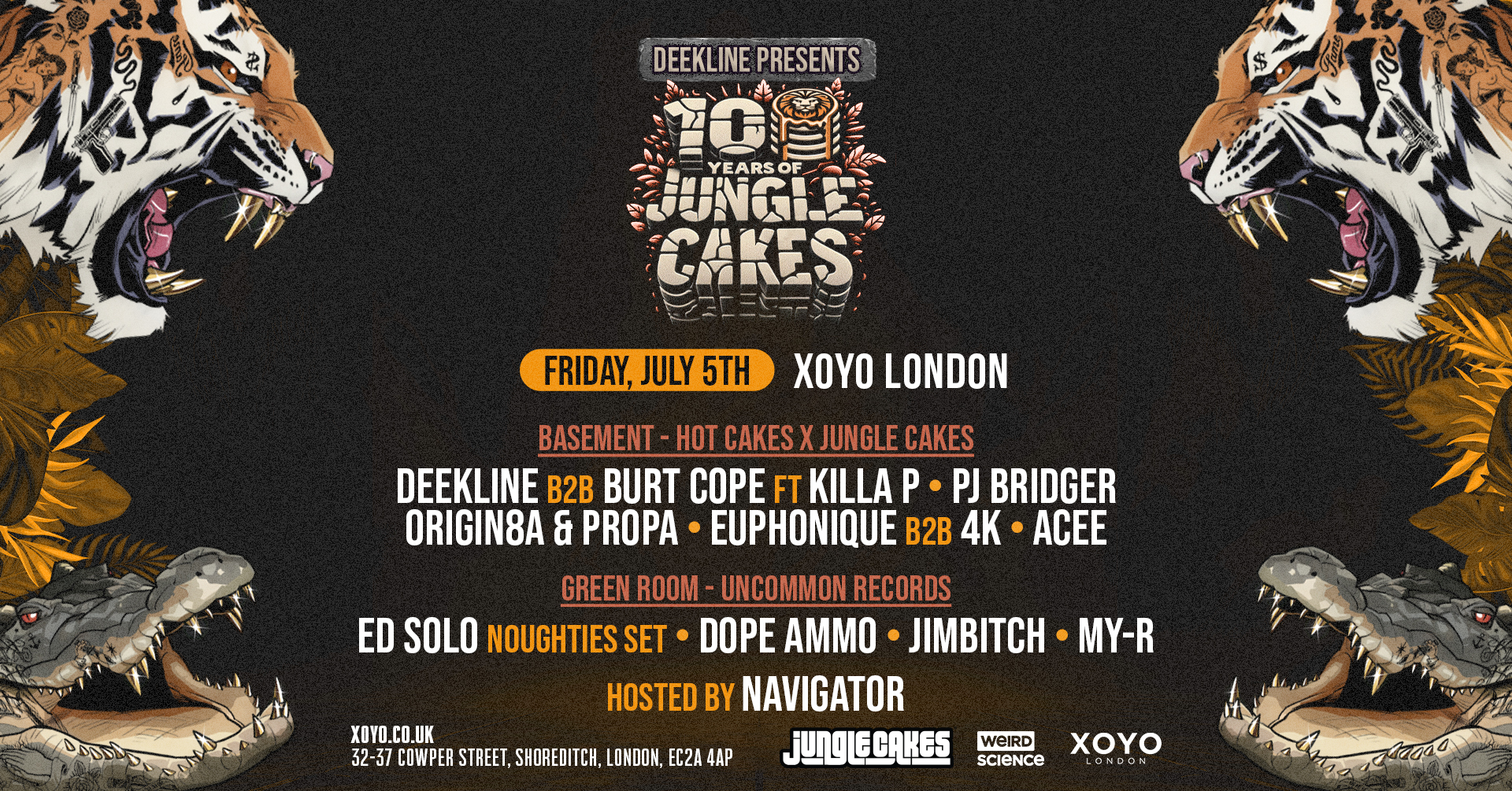 This year we celebrate 10 Years of Jungle Cakes in the dance, the UK’s leading purveyors of dubwise Jungle / Drum & Bass. Taking over the iconic XOYO, for four Friday nights in July this summer, with specially curated line ups from Deekline, Ed Solo, Navigator and Benny Page, the crew will be bringing the heat like never before! 💥🦁🔊🔥
