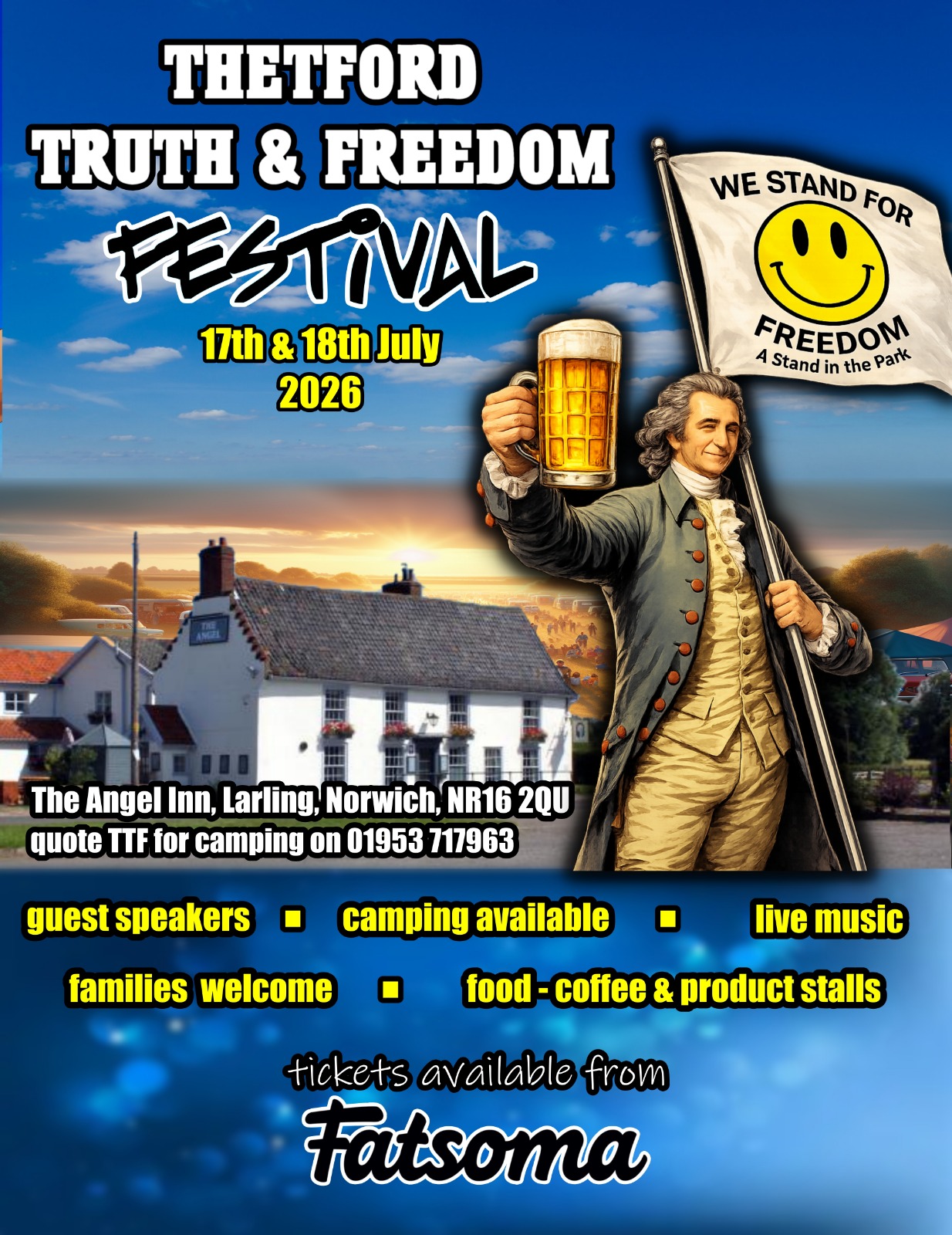 The Thetford Truth and freedom movement (including Thetford Stand In The Park and Thetford Council Watch) will be organising this years annual Truth and Freedom Festival at the Angel Inn, Larling, Norfolk NR16 2QU on Friday and Saturday the 17th and 18th of July 26.
