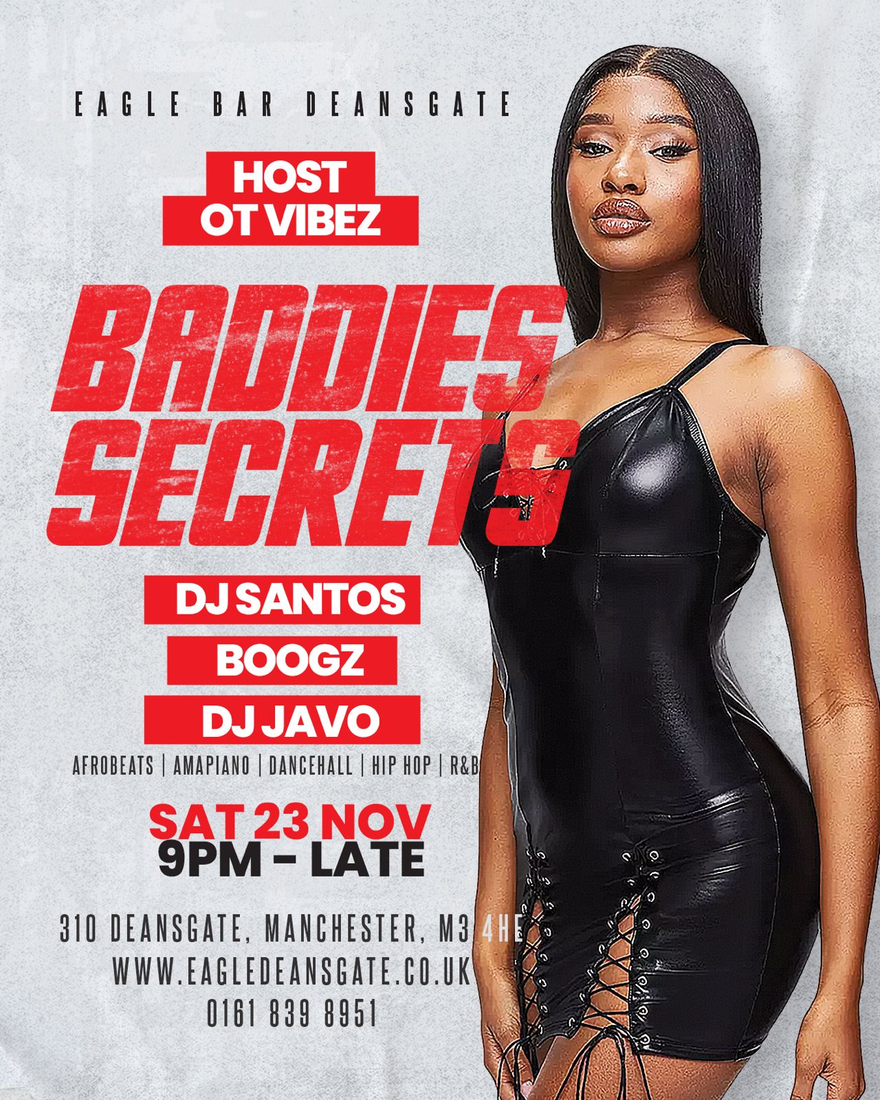Welcome to BADDIES SECRET! Get ready for a night filled with the best Afrobeats, Amapiano, HipHop, RnB, and Bashment music at Eagle Restaurant and Bar. Join us on Sat Nov 23 2024 at 22:00 for a party you won't forget. Bring your friends and dance the night away to the hottest beats. Don't miss out on this epic event!