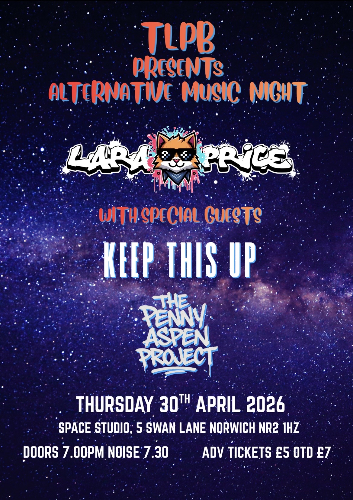 TLPB (The Lara Price Band) presents an alternative music night held at Space Studios, Norwich 30th April, 2026. 3 East Anglian bands who will promise a night full of noise, energy and fun!