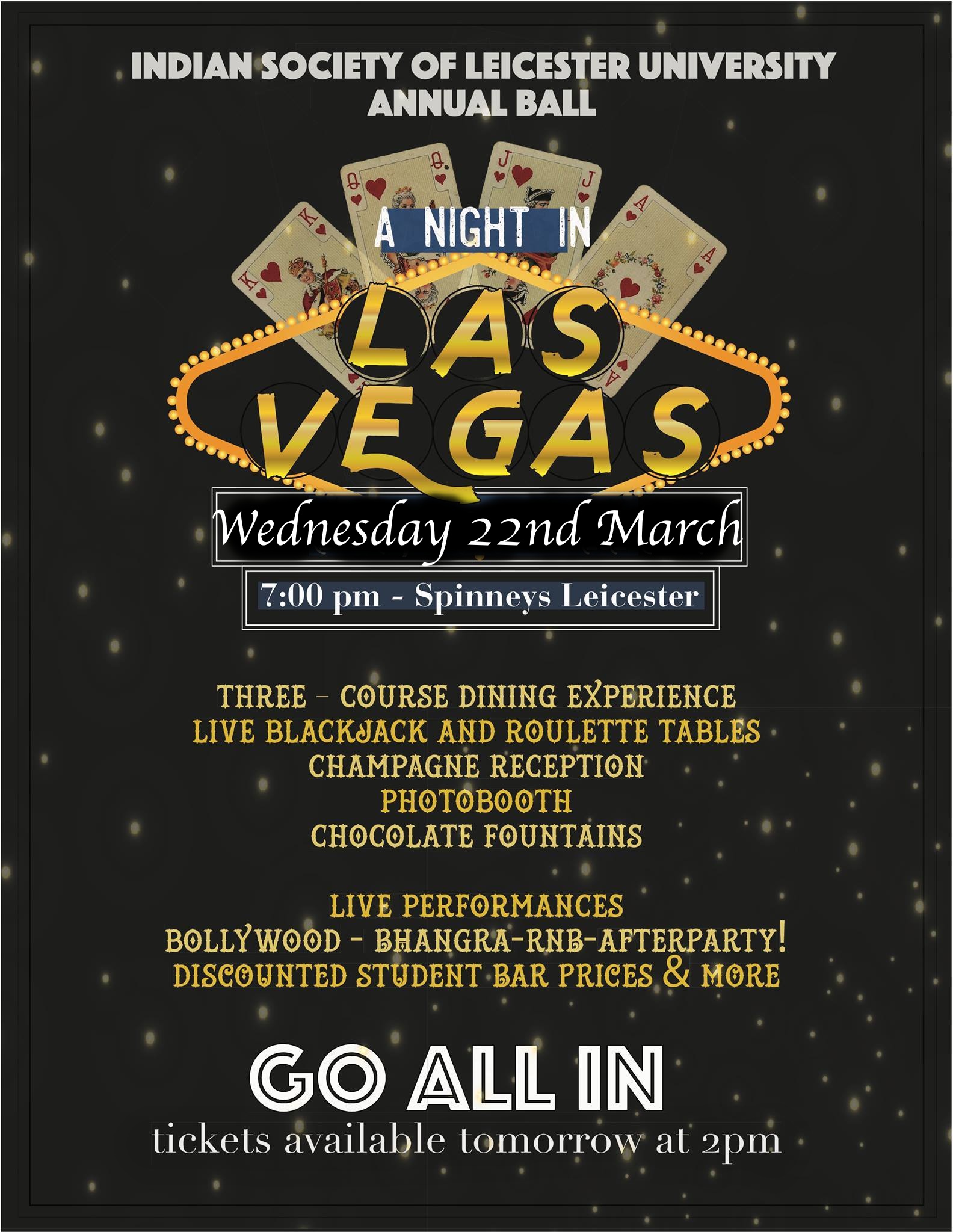 Prepare yourself for the biggest event of the year…A Night in Las Vegas with Indian Society Leicester!Tickets are going to sell out this year, and this is sure to be one of the hottest of the year, so be ready!We wish to go out with the biggest bang possible, and that is exactly what will happen with The Grand Vegas Ball! The Indian Society of Leicester cordially invites you to dress up, sit back, relax, get entertained and join us in our biggest celebration of being a family within leicester. This is our last event of the term, and trust us when we say we’re going to leave everyone wishing it wasn’t.=-=-=-=-=-=-=HIGHLIGHTS