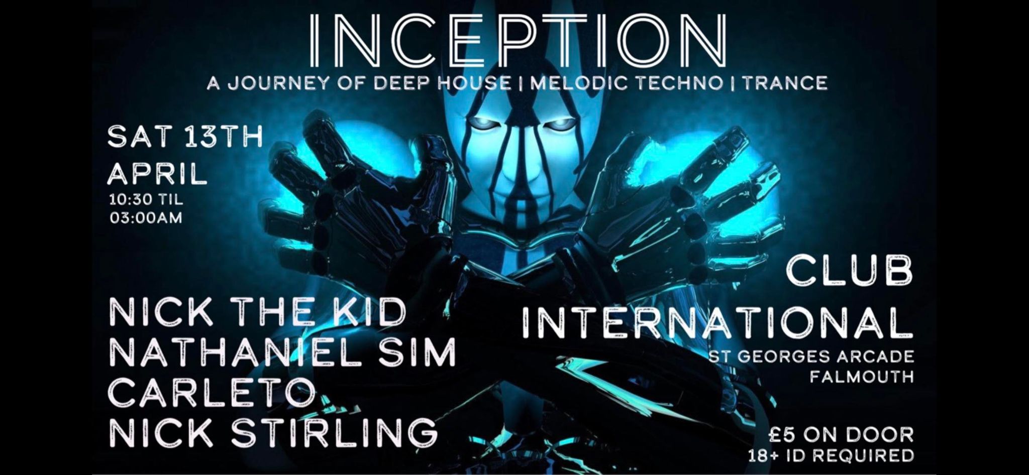 Ticket includes FREE entry to the afters at Club International St Georges Arcade, where you can continue the night until 3am with 4 more of our talented DJs who will increase the tempo throughout the evening from more Melodic Techno right through to our special guest DJ NICK THE KID who will be bringing you one of his legendary Trance sets for the final hour.