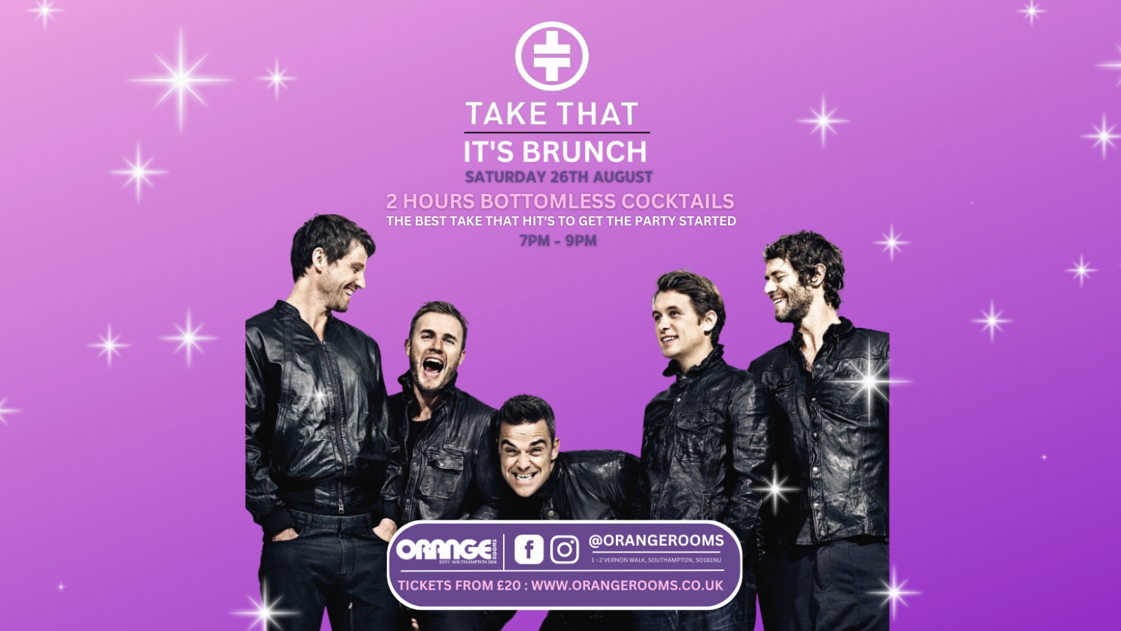 Southamptons number 1 venue for brunch parties next up Take That It’s Brunch! All tickets include FREE entry to Orange Rooms after the event to carry on the party until 3am!