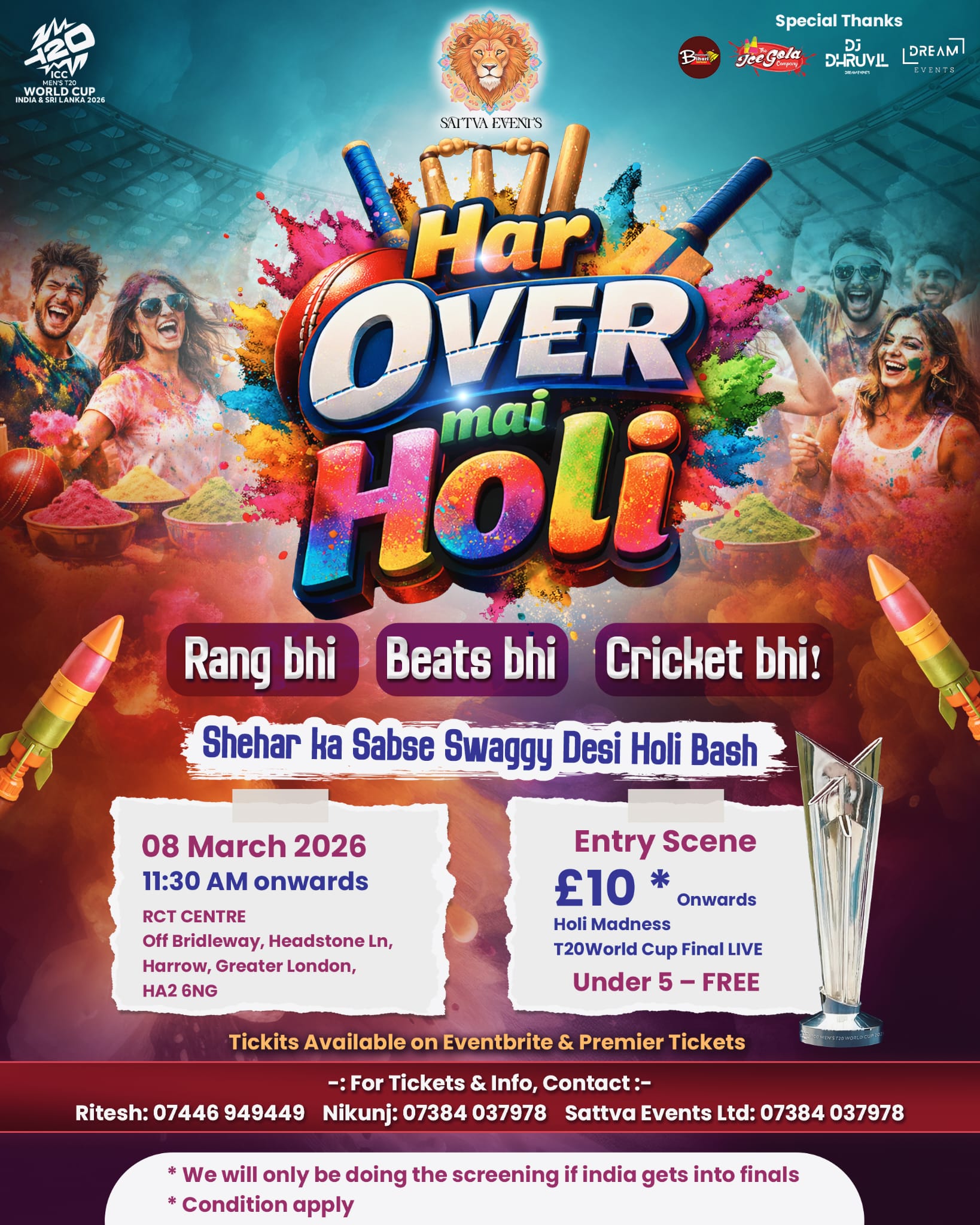 🔥 £15 – Holi Madness + T20World Cup Final LIVE 🇮🇳🏆