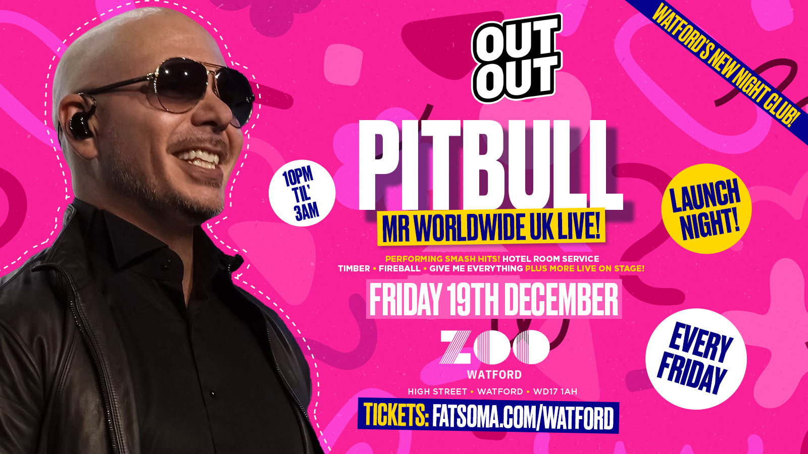 Watford… get READY! 🚨 This is the BIGGEST Out Out Fridays of the year and we’re turning the club into a full-on Mr. Worldwide takeover! 🌎🐾