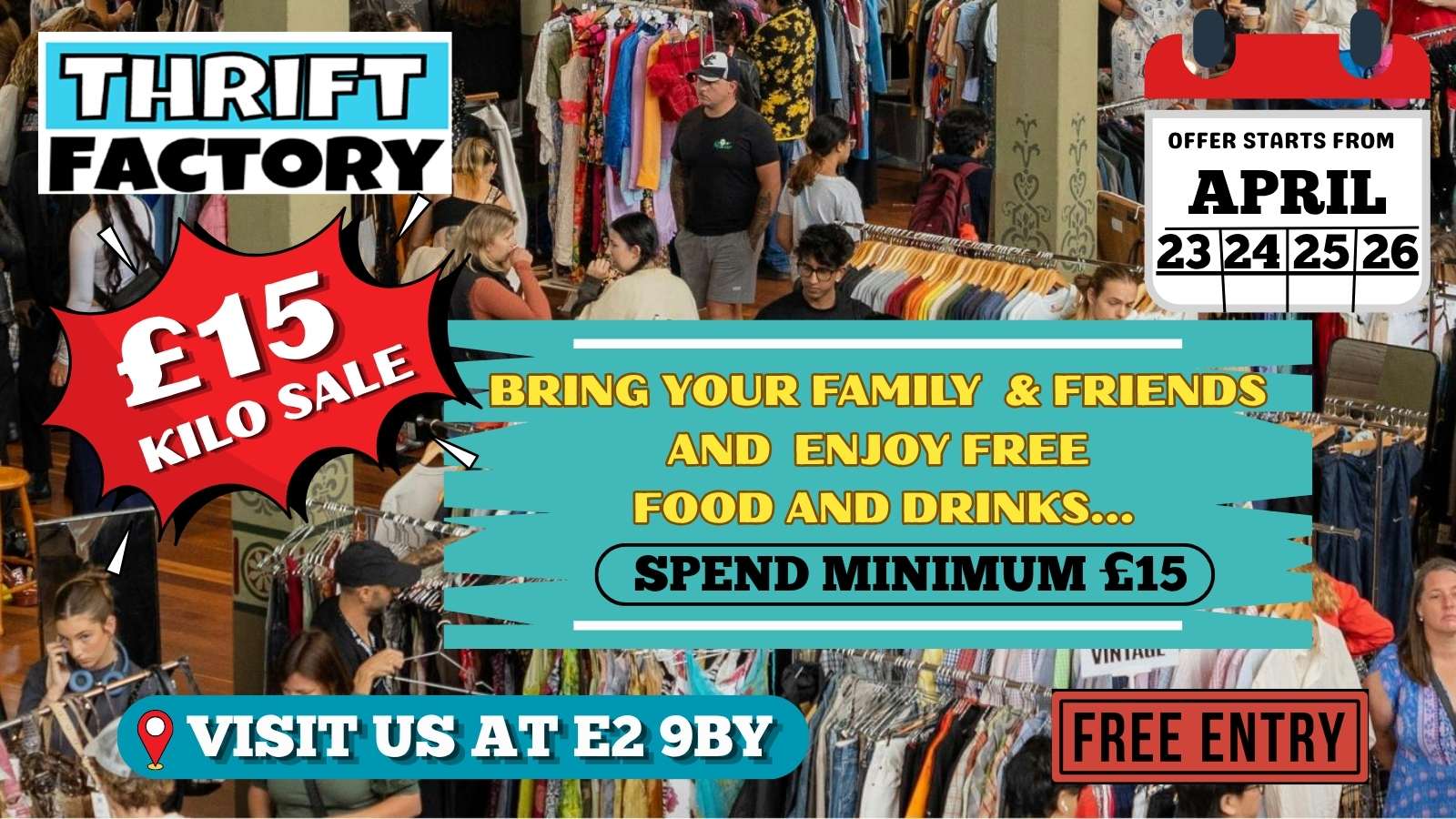 Looking for the best Vintage Sale in London? Join Thrift Factory from April 23rd to 26th April for a massive stock refresh! Grab high-end branded and vintage pieces at a fraction of the price—only £15 per kilo.