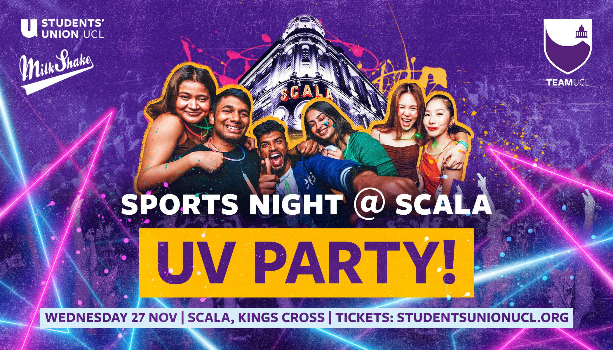 Tickets: https://studentsunionucl.org/whats-on/events-activities/teamucl-sports-night-scala-uv-party-27-november