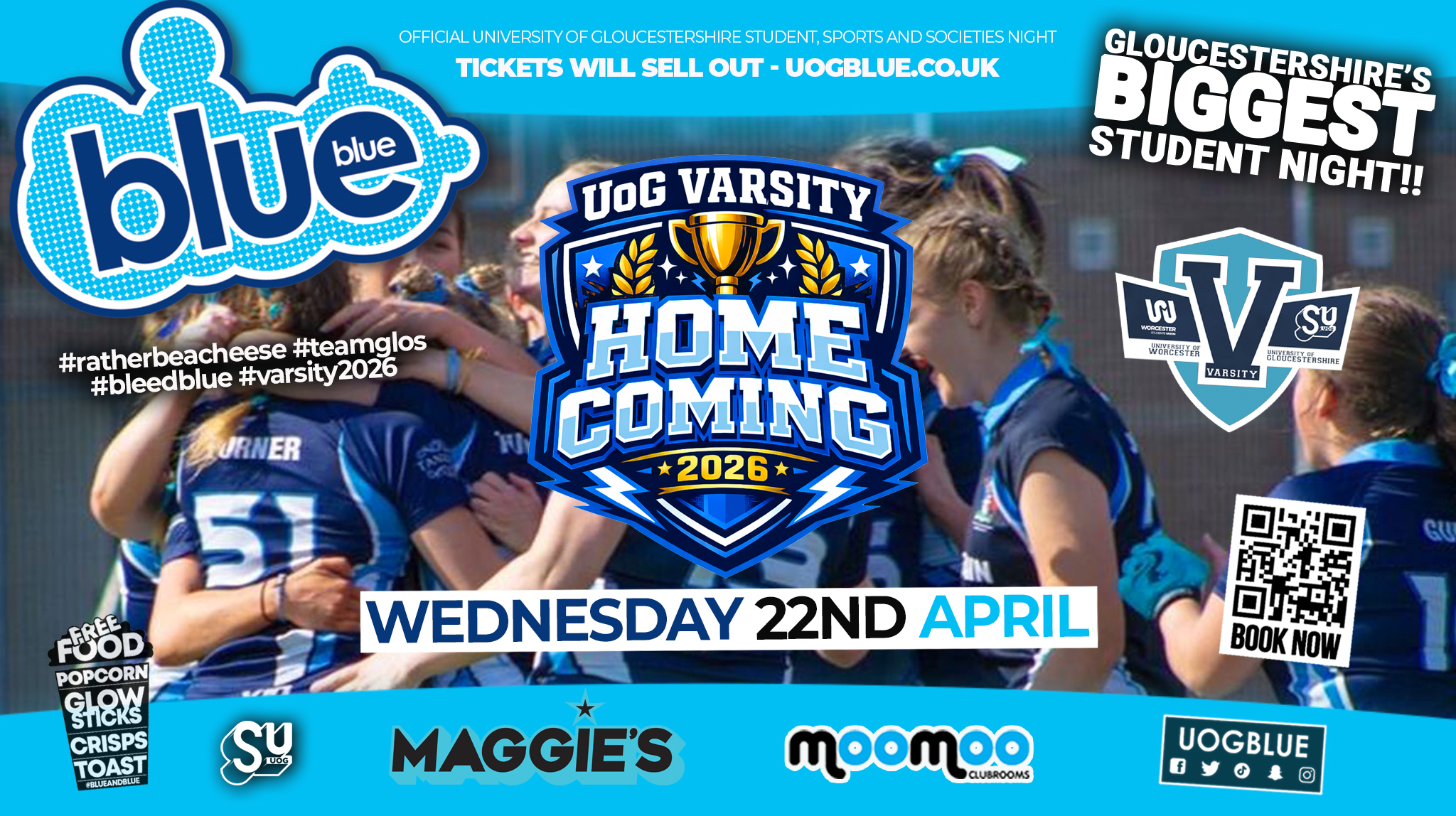 This is the Official Varsity Homecoming Finale — the one night the entire university comes together to close Varsity in style. #teamglos #bleedblue #ratherbeacheese💙 Gloucestershire’s Biggest and Best Student Night AND the Official UoG Student, Sports and Societies Night! 🥳