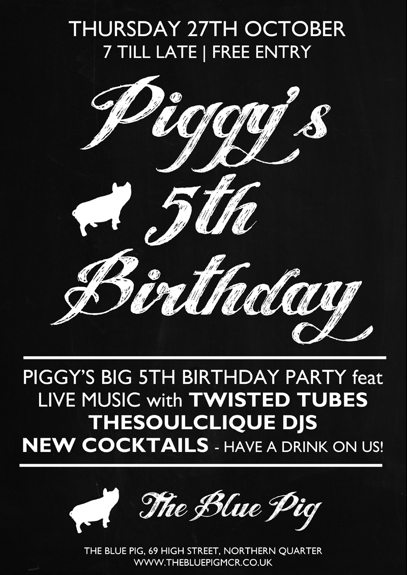 It's the Pig's Big 5! To celebrate an amazing 5 years and to thank you all for your support, Northern Quarter's most illustrious drinking den The Blue Pigis throwing a massive party with live music feat the brilliant Twisted Tubesbrass outfit, The Soul Clique DJs and the chance to sample our brand new cocktail menu. We'd love for you to join us, so come and celebrate all things Piggy on Thursday 27th October; the party kicks off at 7pm, so get here early and have a drink on us!Everyone is welcome; bring a friend or three along for the ride.