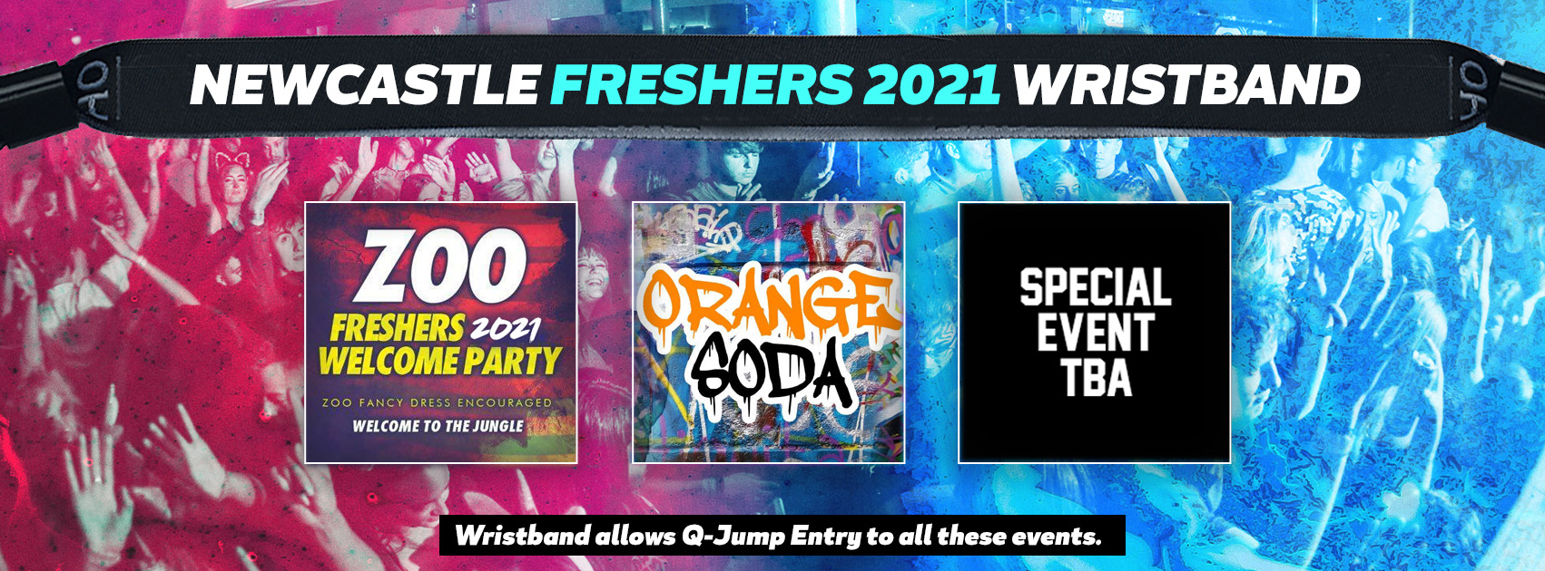 The ultimate Freshers Wristband which gains you Q-Jump access and entry to 3 of the biggest Freshers Events.. The legendary Freshers Welcome Party - ZOO Theme Special, The 00s Throwback R&B Special and a special event TBA!