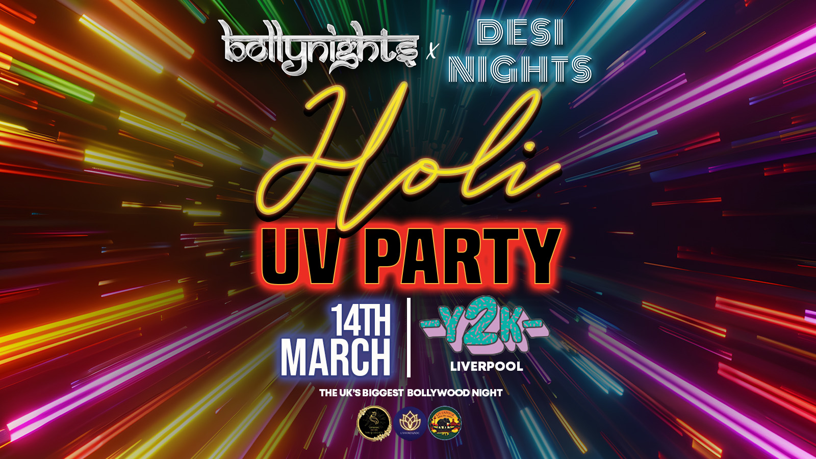 The UK’s biggest Bollywood night is back in Liverpool with Desi Nights, to bring you an electrifying night filled with UV colour paint, glowsticks, and non-stop Bollywood beats! 🎶🔥 Create unforgettable Holi memories and don’t miss out on this legendary night!